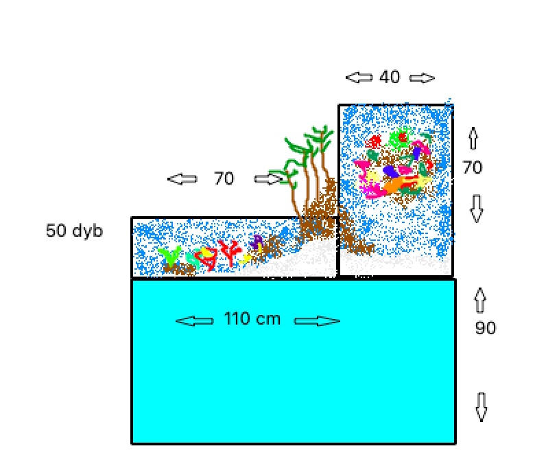 Jeg synes at dine tegninger ser interessante ud. Eller i hvert fald tankerne bag. Men hvorfor ikke lave akvariet som et rigtigt drop off? Derved vil du kunne se fiskene bevæge sig rundt i forskellige miljøer og få en helt anden oplevelse ud af det.
