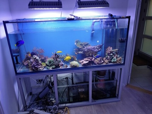 Jeg havde ferskvandsakvarie som barn med lidt af hvert. Startede op igen med ferskvand, da jeg i 25 års fødselsdagsgave fik to guldfisk (Jay and Bee) i en bowle. Næste skridt var at starte barndommens akvarie op, det var på 110 liter, og blev opgraderet over et par gange til 530 liter med discus fisk, primært de mere naturlige varianter. Sommeren 2014 købte jeg et indkørt RSM130 med saltvand til min søns værelse, hele familien er meget begejstret, og hurtigt står det klar at discus fiskene i alrummet, skal skiftes ud med salt. Så i foråret 2015 købte jeg et brugt 530 liters saltvandsakvarie i Nordjylland, og får købt ind af brugte stumper. Mit første større saltvandsakvarie kom op at køre i foråret 2015. Flere af mine fisk er fra det forår. Det var et Akvastabil akvarie, kan ikke huske modellen, men underskabet var et Move, set bakspejlet egner det sig bedre til ferskvand. Salten krøb konstant over kanterne og trækabinettet brød sig heller ikke om salten og fugten.