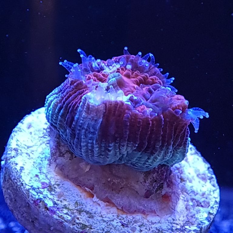 Jeg har fået hjælp til ID af Leonardo den Breejen. Det er en madracis sp. De fleste madracis er fra Caribien så det er muligvis en ret så sjælden koral i hobbyen (siden det er ulovligt at høste/sælge/eksportere koraller fra det område. Ret cool og en fed farve! Hvad synes I?