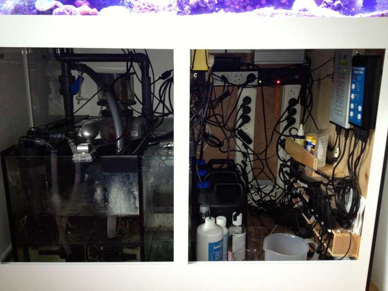 Blev for alvor "hooked" igen, da jeg på nettet så nogle fantastiske levende koralrevsakvarier, og samtidig i Storcenter Nord i Århus kunne se et i virkeligheden (det første de havde opstillet) med store Acropora staghorn og andet guf. Blev dog noget bleg, da jeg fik lov til at kikke i "maskinrummet", og kunne se, at man nok nærmest skulle have en Ingeniøruddannelse for at fatte alt det isenkram, der var proppet sammen dernede.