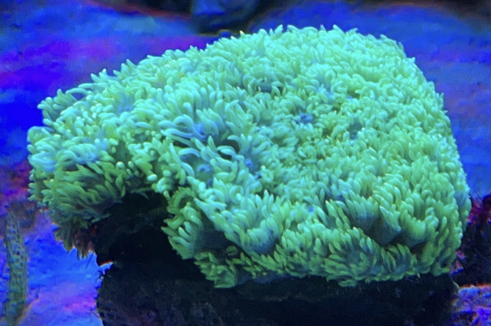 Homophyllia klumpen overvejer jeg at skille lidt ad. Den nederste gule er pænt “træt” kan man se….. Jeg giver dem lige lidt tid og hvis den ikke retter sig så må jeg igang m hammer og mejsel 👍🏼