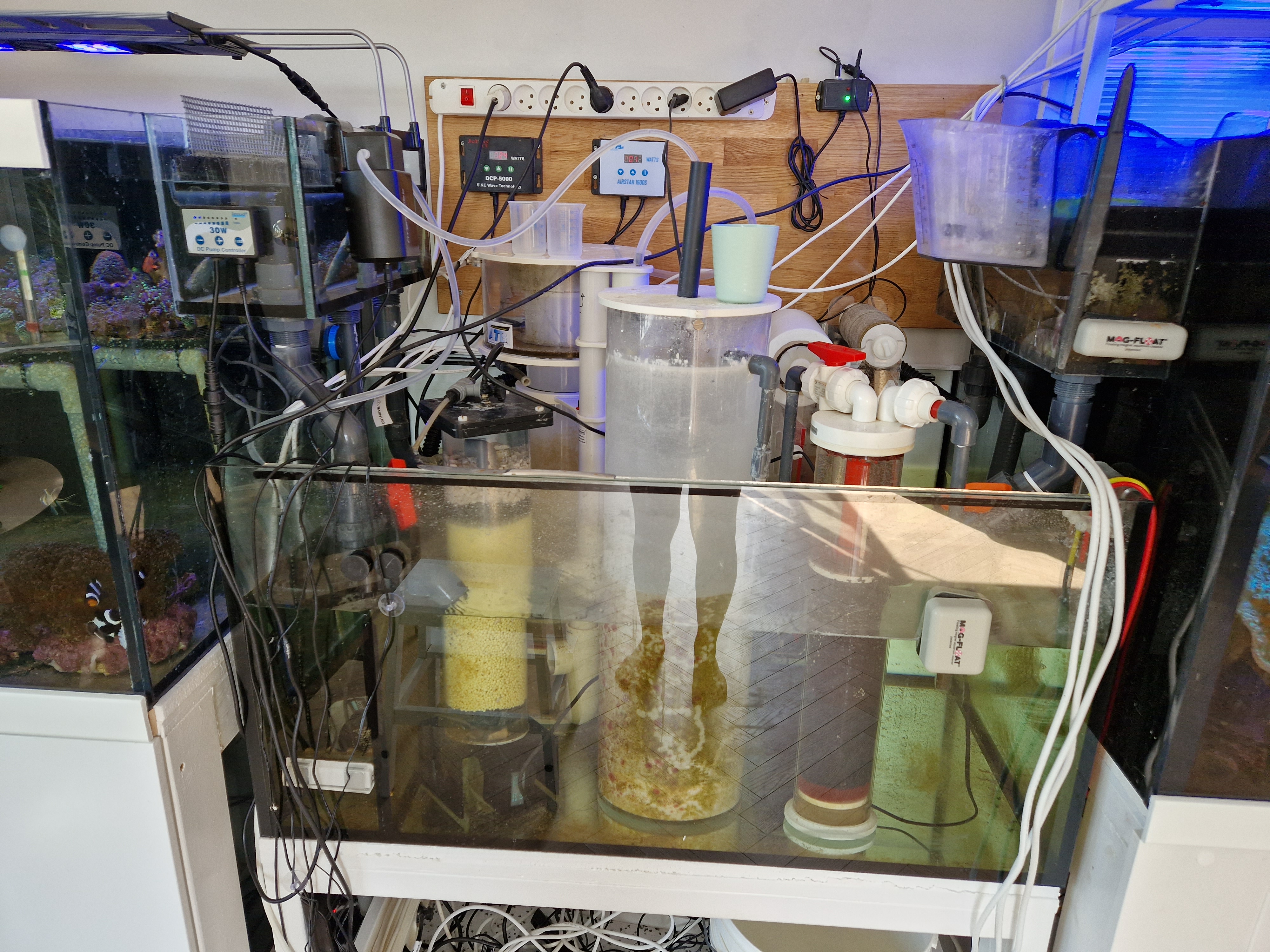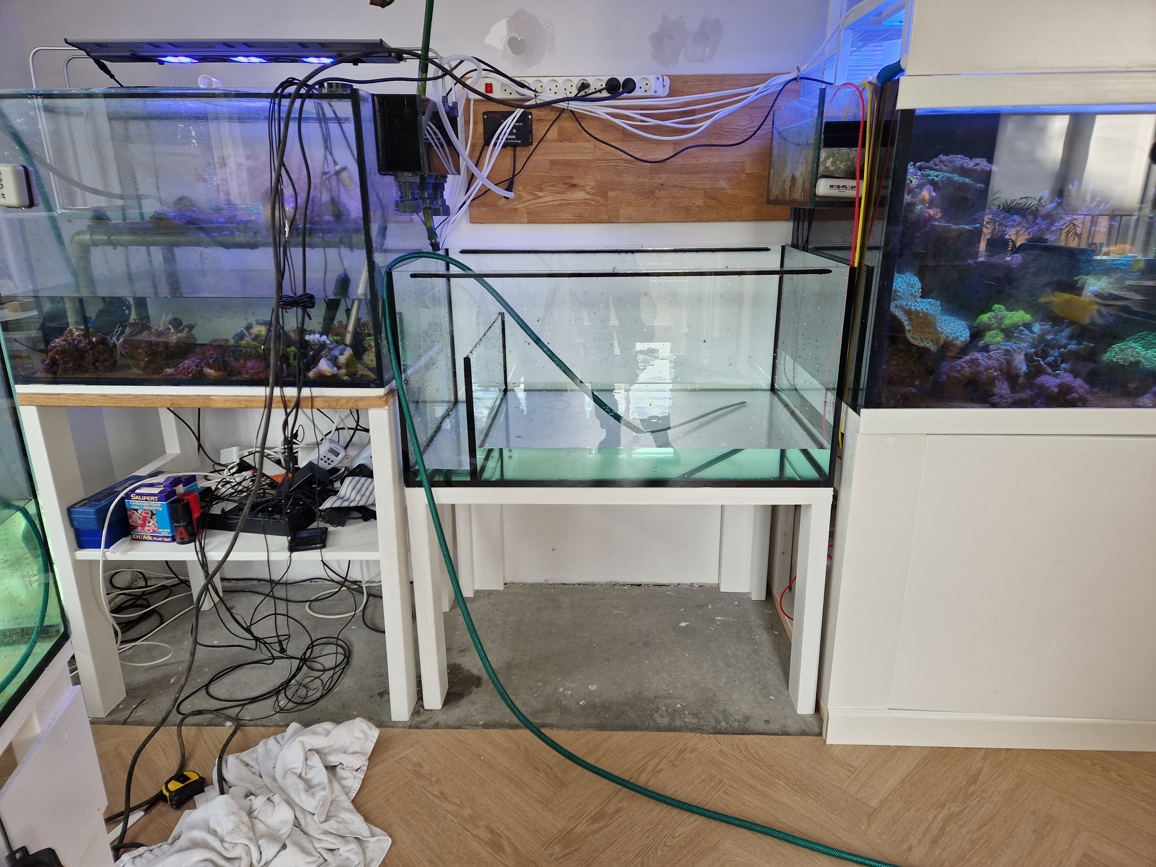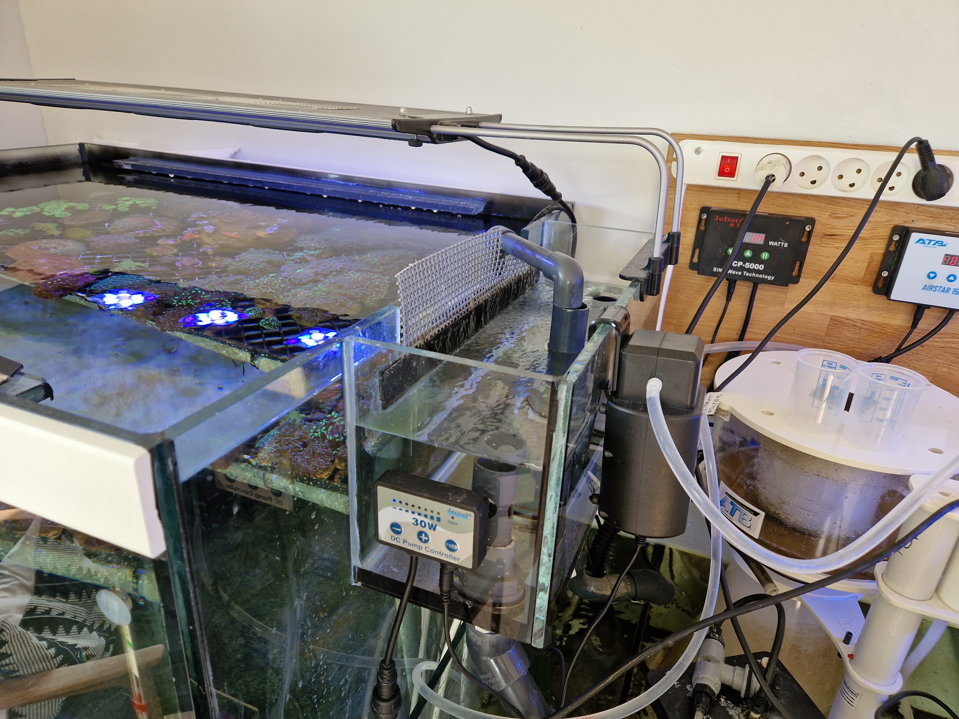 Selve skiftet tog fra kl 10 til 21 sidste lørdag. Alt drillede. Gennemføringer skulle skæres og gik i stykker, slange knækkede, top-off pumpestik knækkede, mit top-off akvarie på 160 liter blev stødt og flækkede - mit bord var ikke kraftigt nok og skulle forstærkes med reglar fra akut tur til Hjem og Fix.