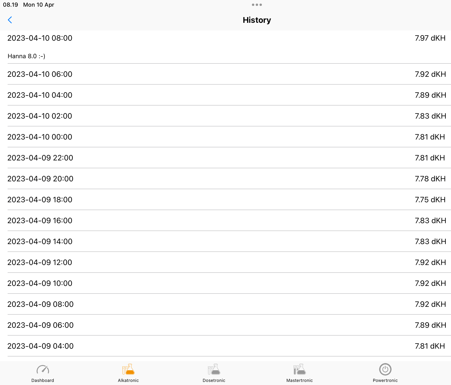 Indtil vider er der skiftet PH sensor, Slanger igen, selvom de kun har kørt omkring 300 tests. Ser ud til at være stabilt nu omkring 8-8,2 dKH og kan ikke forstå de mennesker som evt. bruger Alkatronic som automatisk styring af dKH. Jeg ville ikke sove roligt om natten