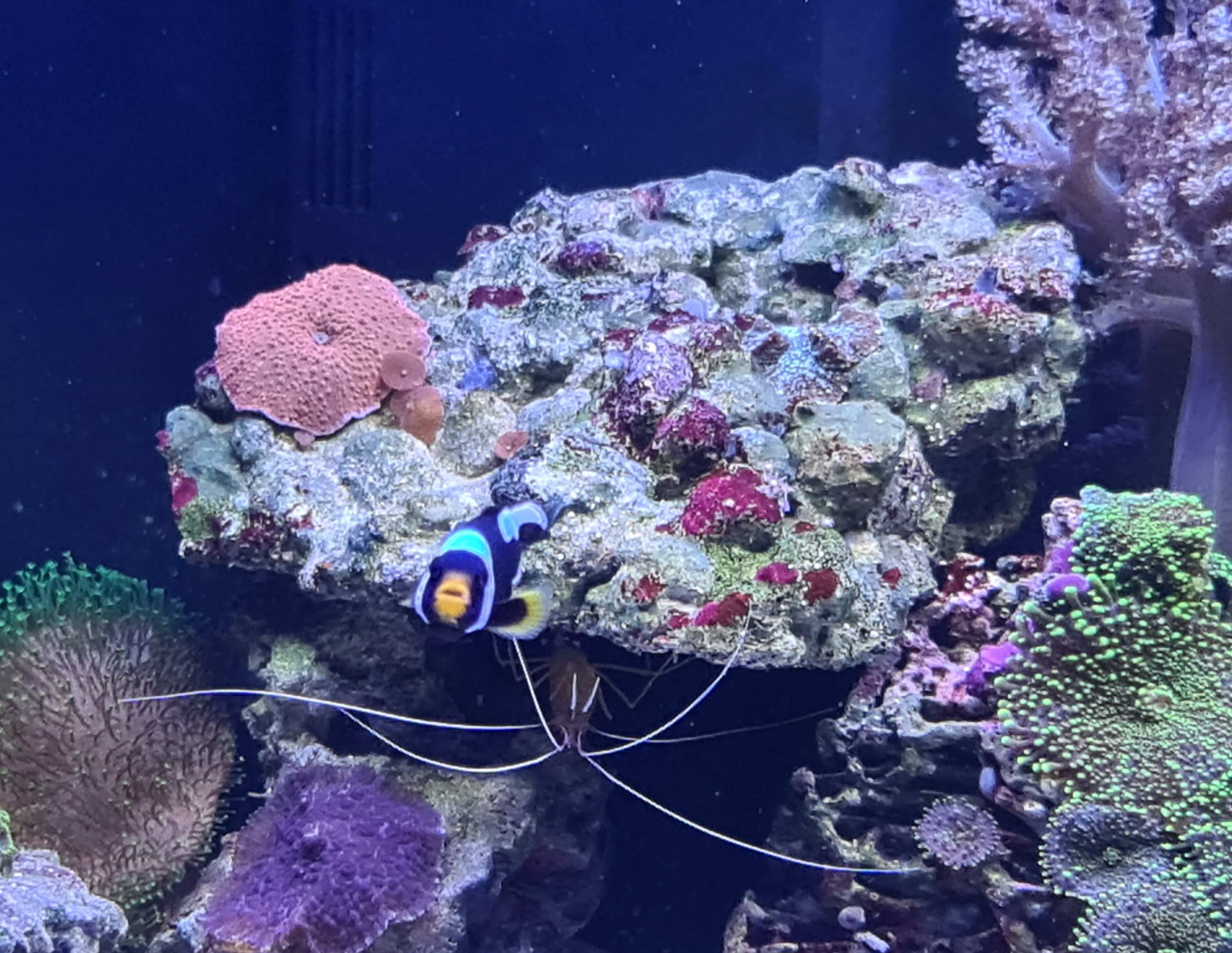 14 dage efter flyttede Keld og Yvonne ind som 2 små saddleback klovnfisk. jeg skal lige love for at Yvonne var en hyæne, da de skulle finde ud af hvilke køn de skulle indtage og Keld måtte finde skjul under og bag sten, det var så slemt, at jeg var bekymret for at hun ville stresse ham ihjel, men heldigvis holdt han ud og hun har nu accepteret ham.