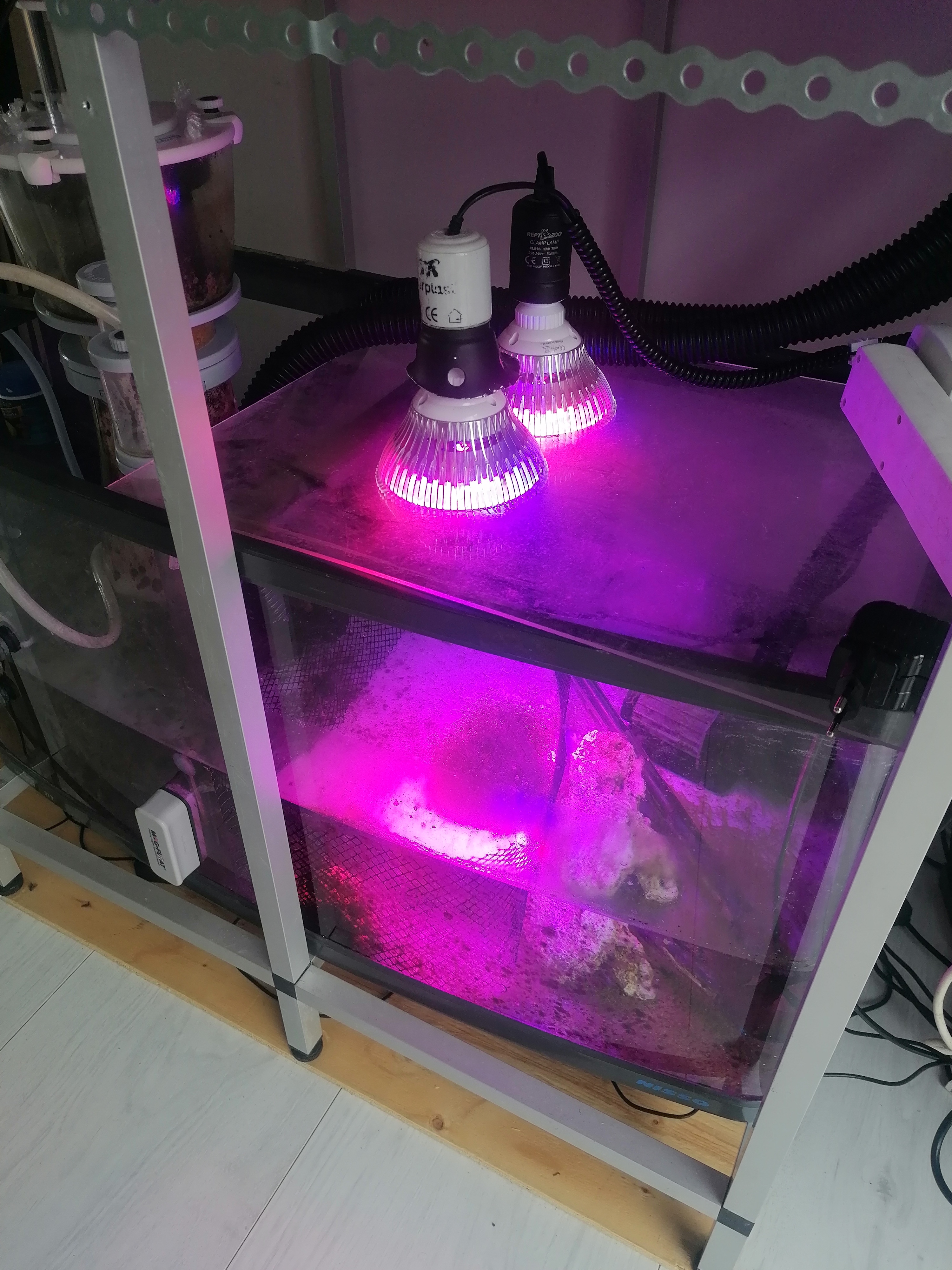 Så idag har jeg fået et refugium i sumpen imellem skummer og retur pumpe sat op. Det er lavet af tagrende net og tre mindre døde sten til at holde det på plads og så mine to led grow spots fra mit gamle cube akvarie!