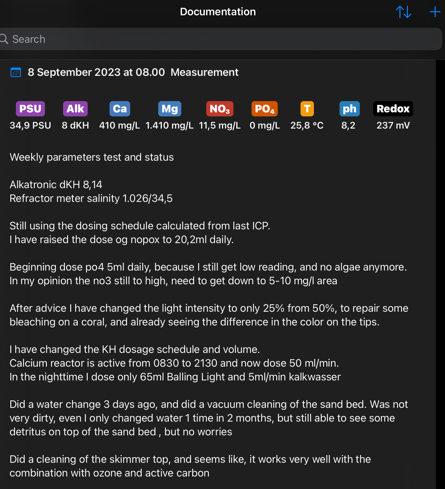 Jeg bruger stadig doseringsskemaet beregnet fra sidste ICP og har desuden hævet dosis af nopox til 20,2ml dagligt. Langsomt falder min NO3, men skal huske på bakterierne skal lige nå at komme op i gear igen. Jeg har gennem lang tid holdt dem i hvile med kun 3 ml/dagligt😊