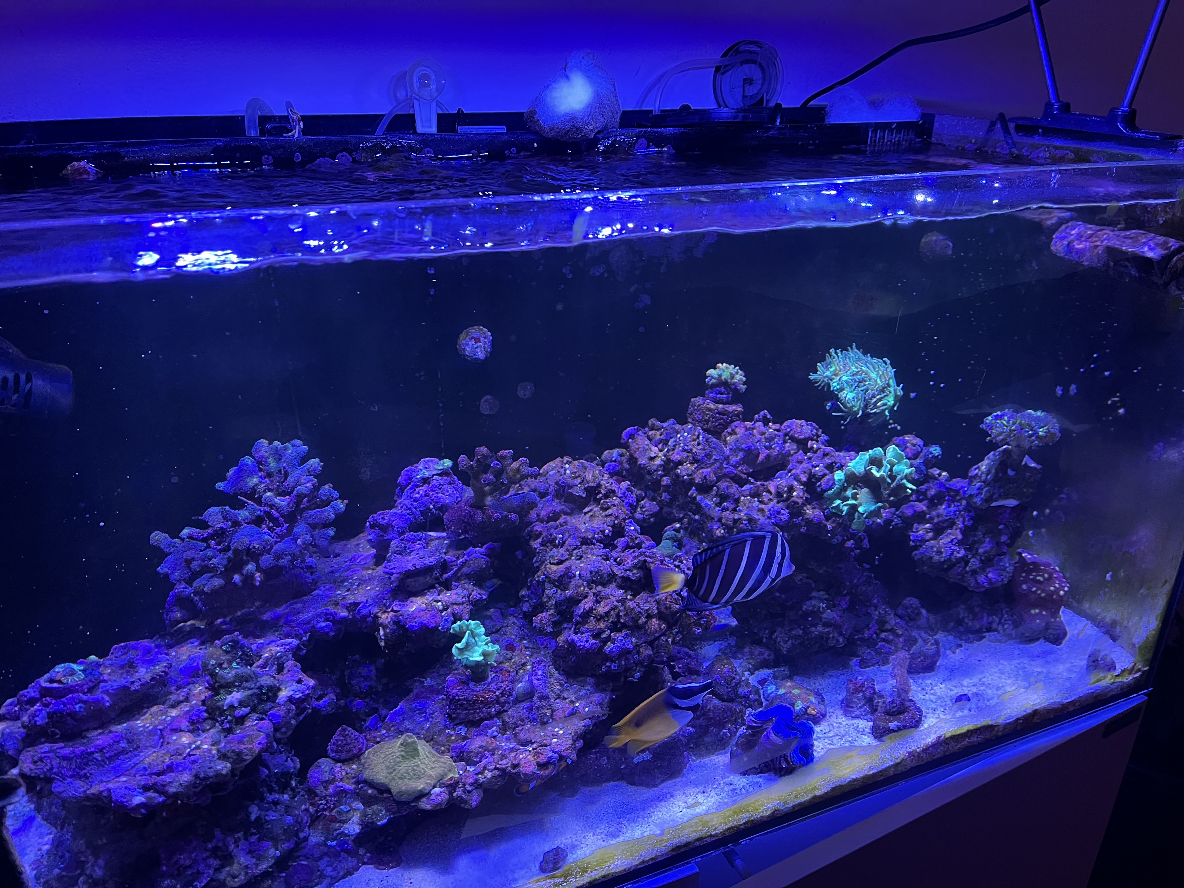 Ting går fremad, ny erhvervet acropora er begynd at sætte deres base dog min tenius, tror jeg den hedder er noget bleg i farven og fik alger på spidser hvorfor den fik brændte spidser så algerne kunne gro ved jeg ikke helt? Men kan skyldes min PH var lav målte den ved lys tænd til 7,7-7,8 og ved lys ned på omkring 7,9-8. Så er gået tilbage til kalkwasser nu hedder den 8-8.2 i løbet af dagen. Mht. at farven på den må være pga. min no3 lå på “0” i ved ikke hvor lang tid har ikke været så skarp på min rutine. Nu dosere jeg lidt no3 når den kommer ned på omkring 5 pt ligger den på 10-15stykker. Har prøvet at fodre mere med tørfoder og Frost men det har kun en effekt på min Po4 som idag ligger på 0,06. Jeg har også tilført mere lys i form af en Kina lampe hedder vist Micmol noget ikke for mere Par men bedre spredning af lys, overvejer at købe en Orphek or3 at kører alle 3 så lys rammer alt.