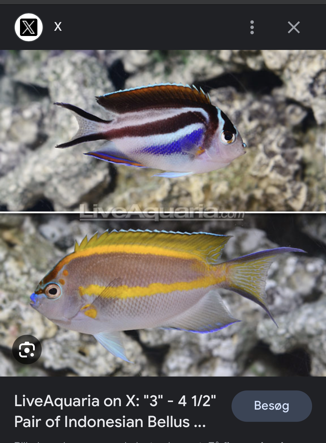 Vakler mellem en “fregnet” kirurg = Acanthurus Maculicpes, eller 2 stk Genichantus Bellus (én af svalehale kejserfiske arterne). Hanner af disse er sjældent i handel, men som ved mange af de andre fisk skifter den mest dominante fra hun til han på et tidspkt. Det kunne være super fedt med sådan et par.
