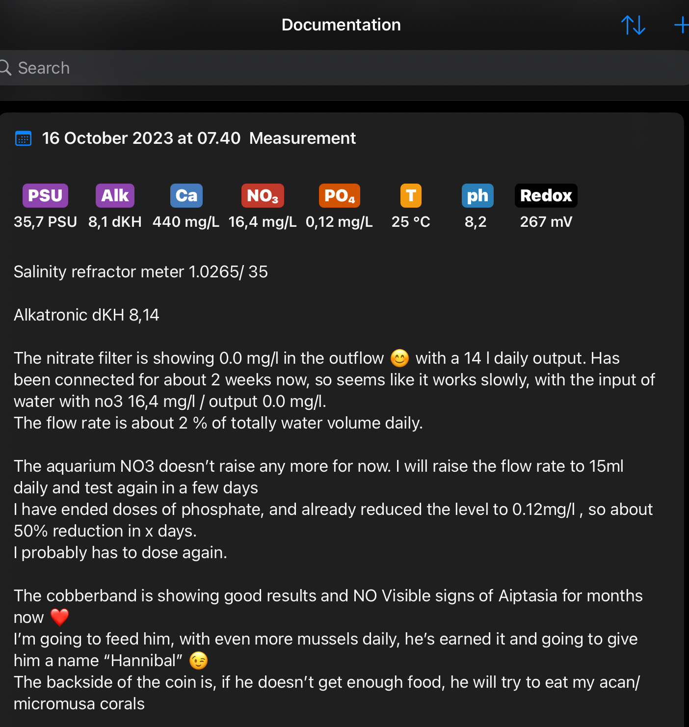 Jeg ser ud til at have fået stoppet stigningen af NO3, men så røg PO4 over 0,1 , der er nok arbejde😜 , men min acropora WD er igen gået i de grønne områder😔