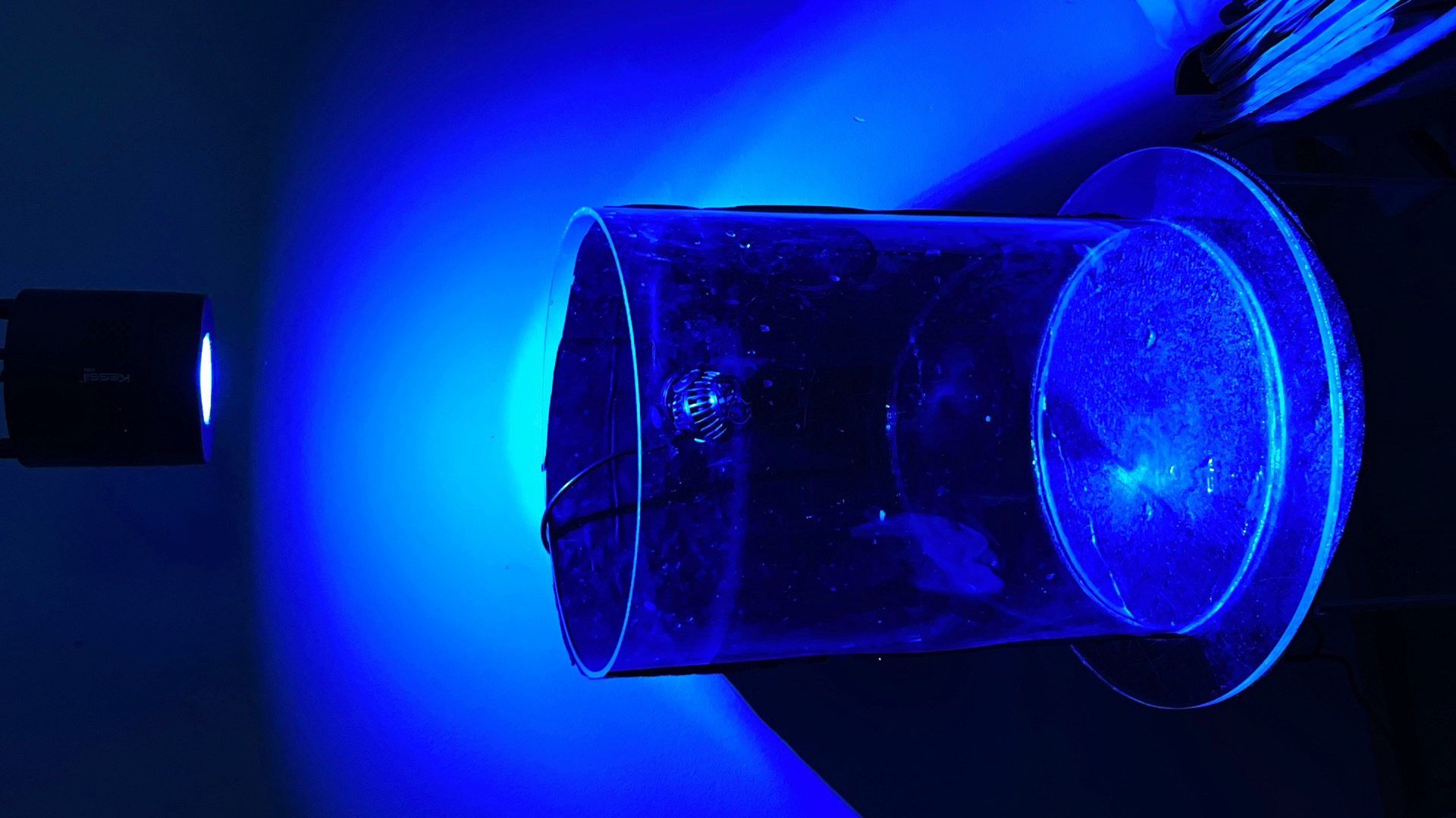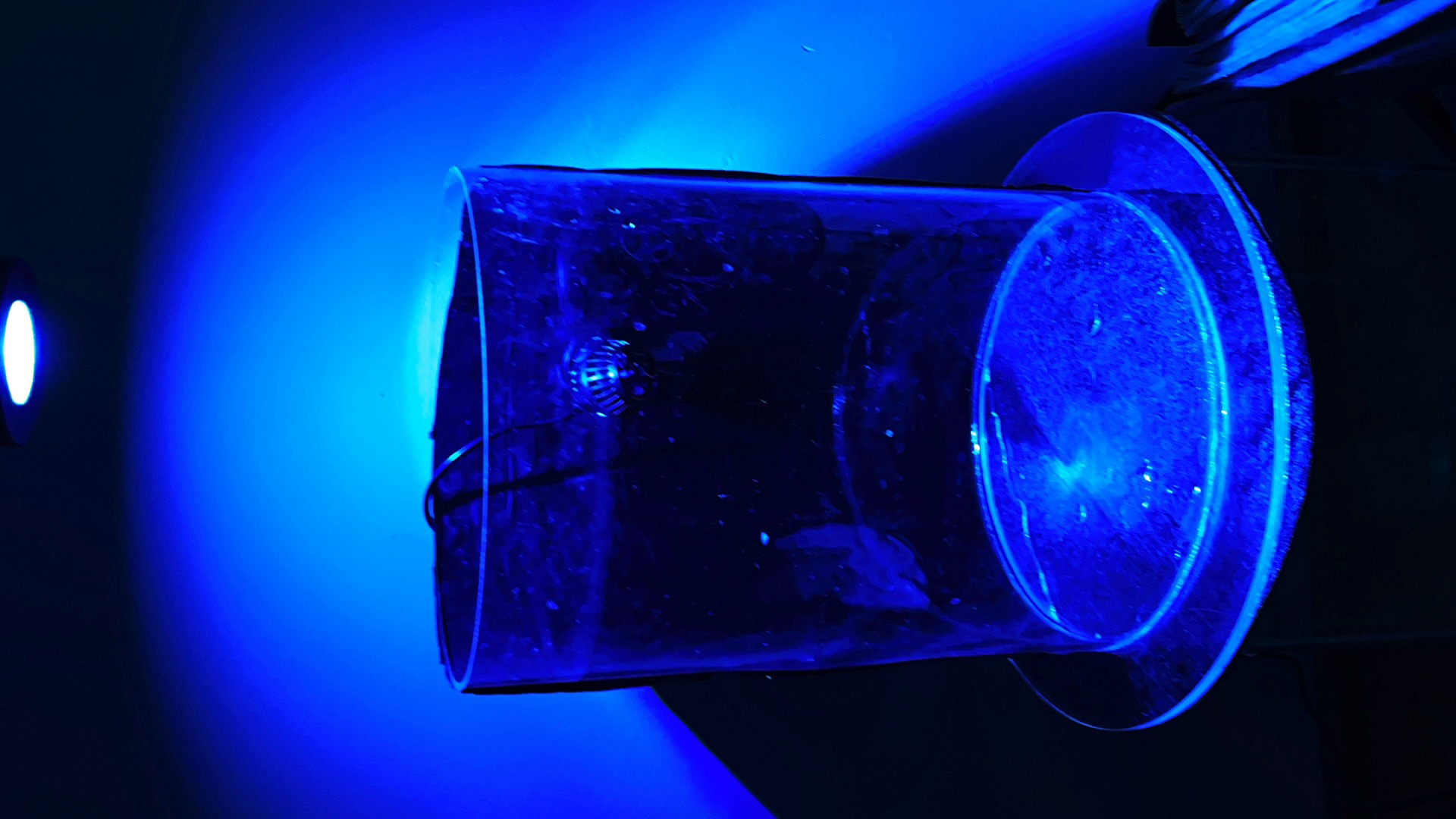 Selve akvariet er et akryl rør jeg har limet på en plade. Diameteren er lidt mindre end en gammeldaws lp, nemlig 30 cm (28 cm indvendigt) og højden er 40 cm, har tænkt at kører med vand i 35 cm højde. Så i alt lidt mere end 21 L rumindhold. Så skal sten og koraller trækkes fra, så på en god dag er det nok 17-18 liter beskidt saltvand