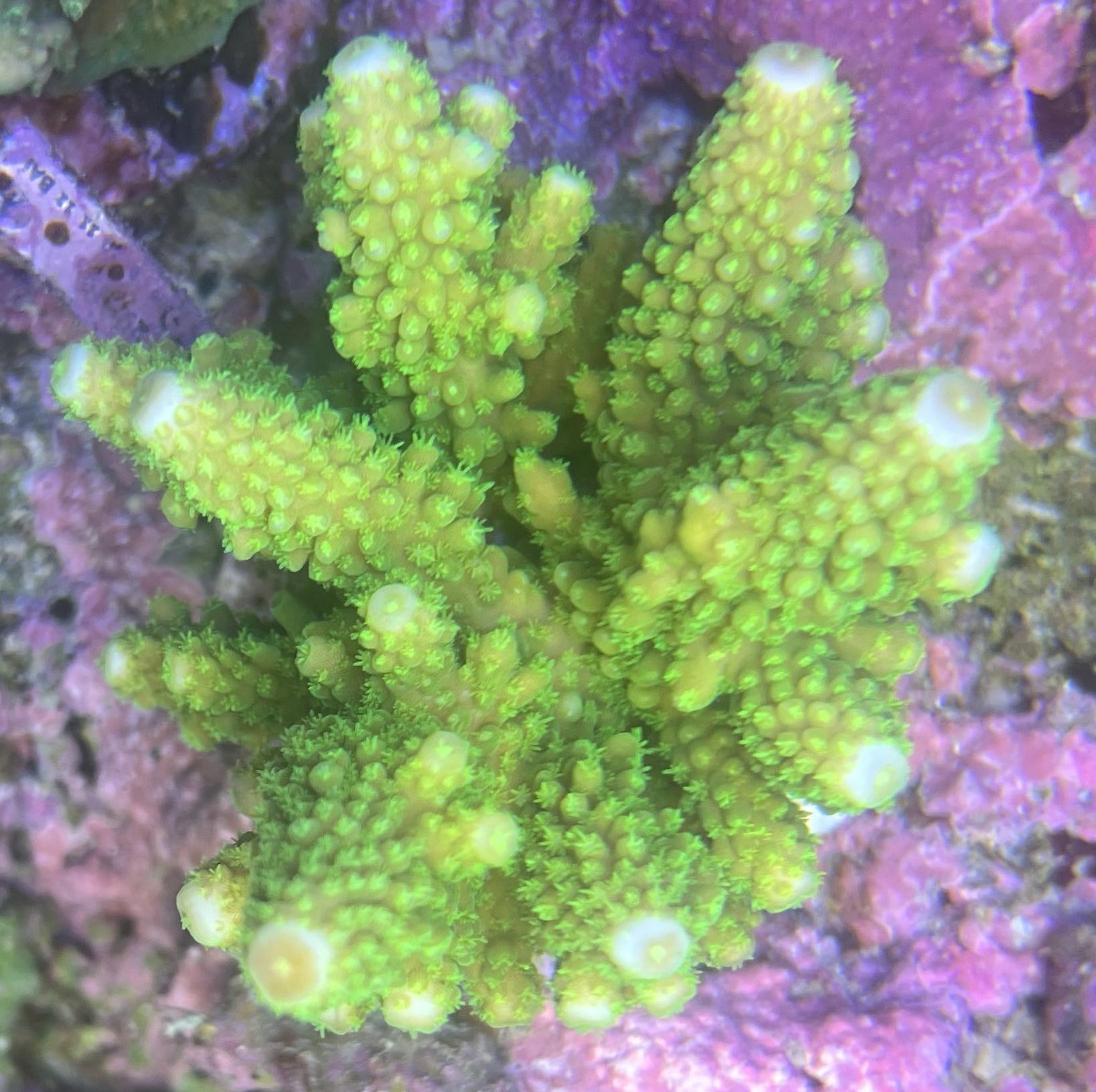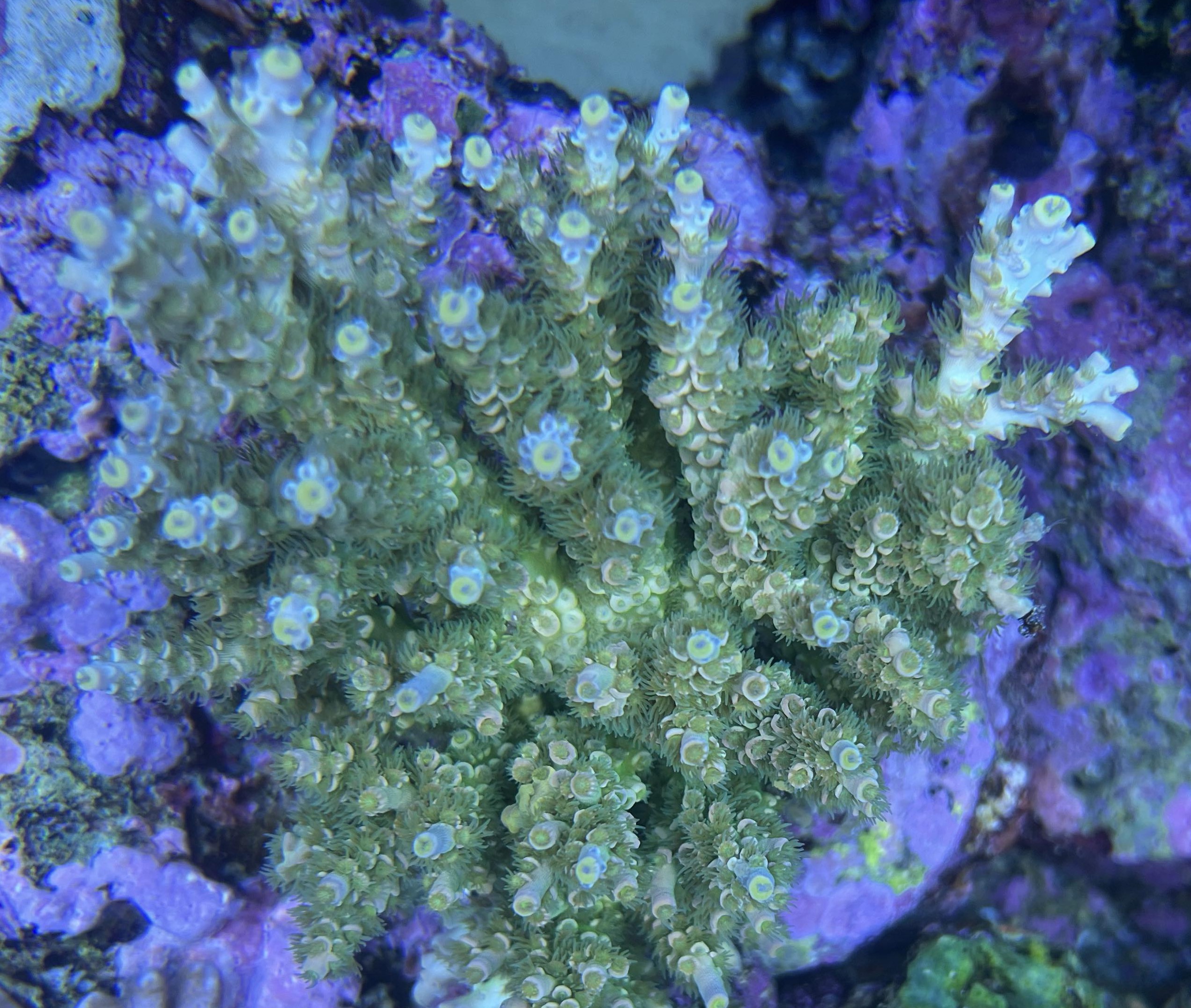 Her er lidt billeder af væksten på en Acropora digitifera da jeg fik den havde den næsten ikke nogle polypper ude.. men med tiden er den blevet helt dækket med polypper.