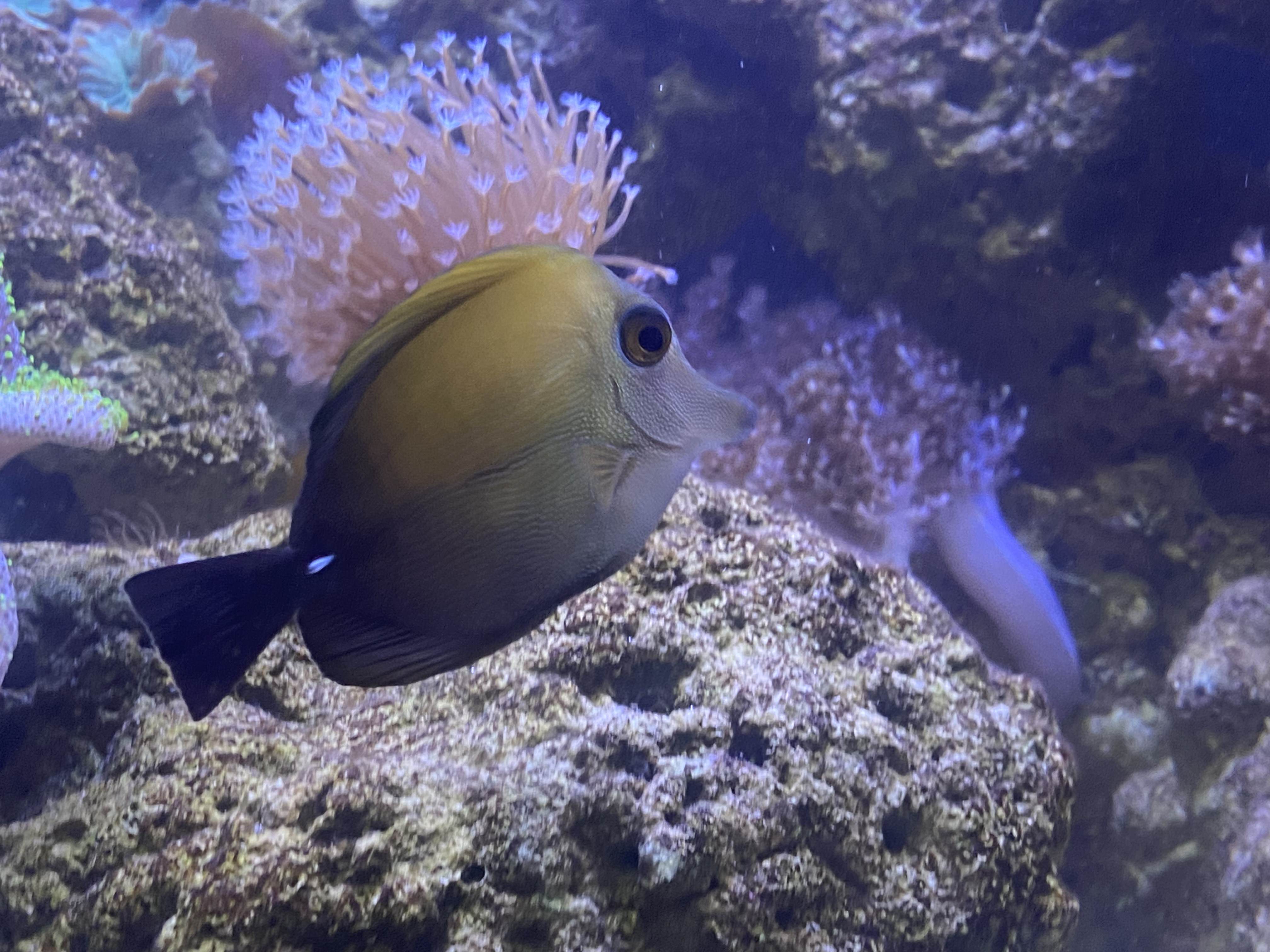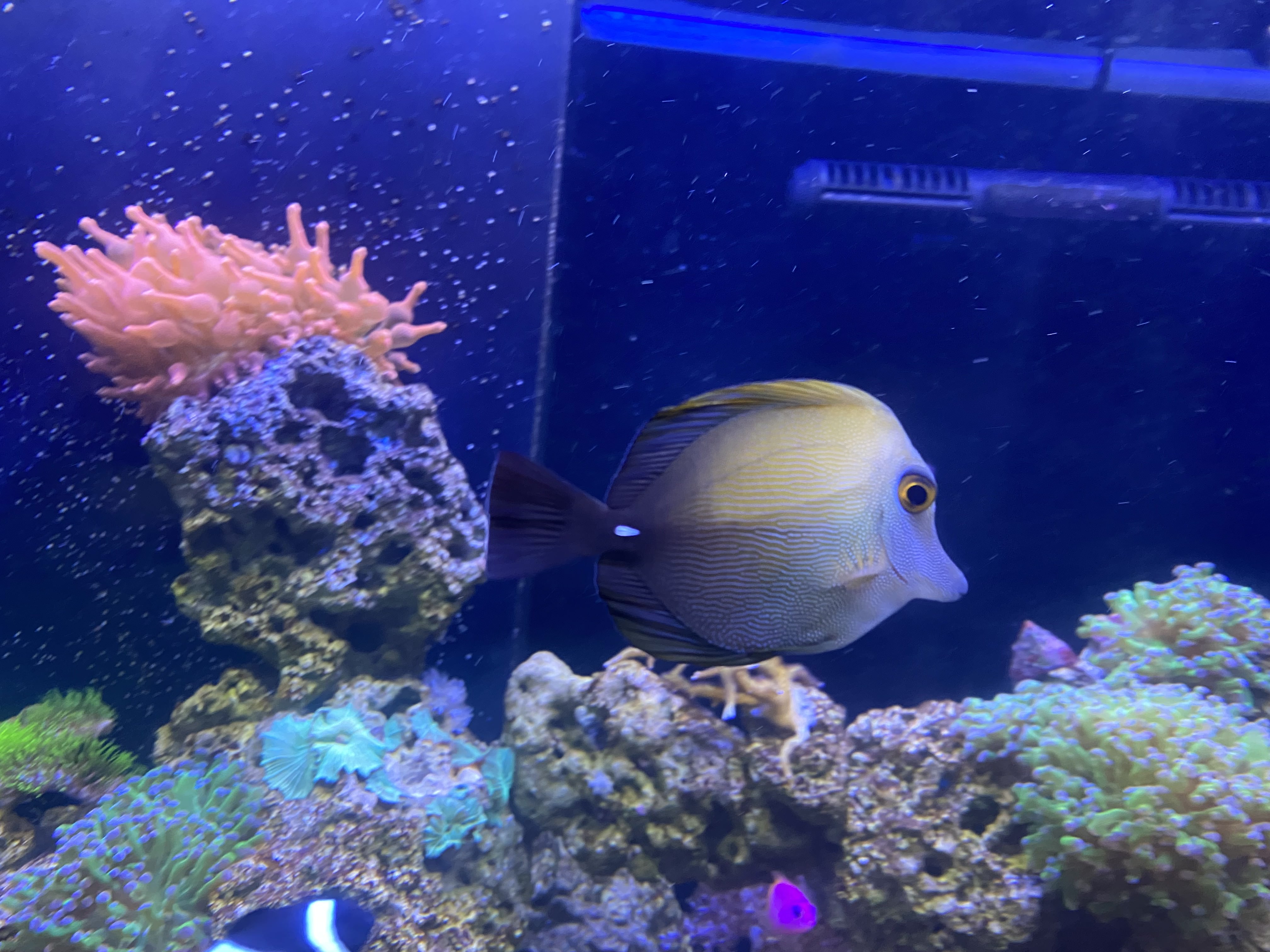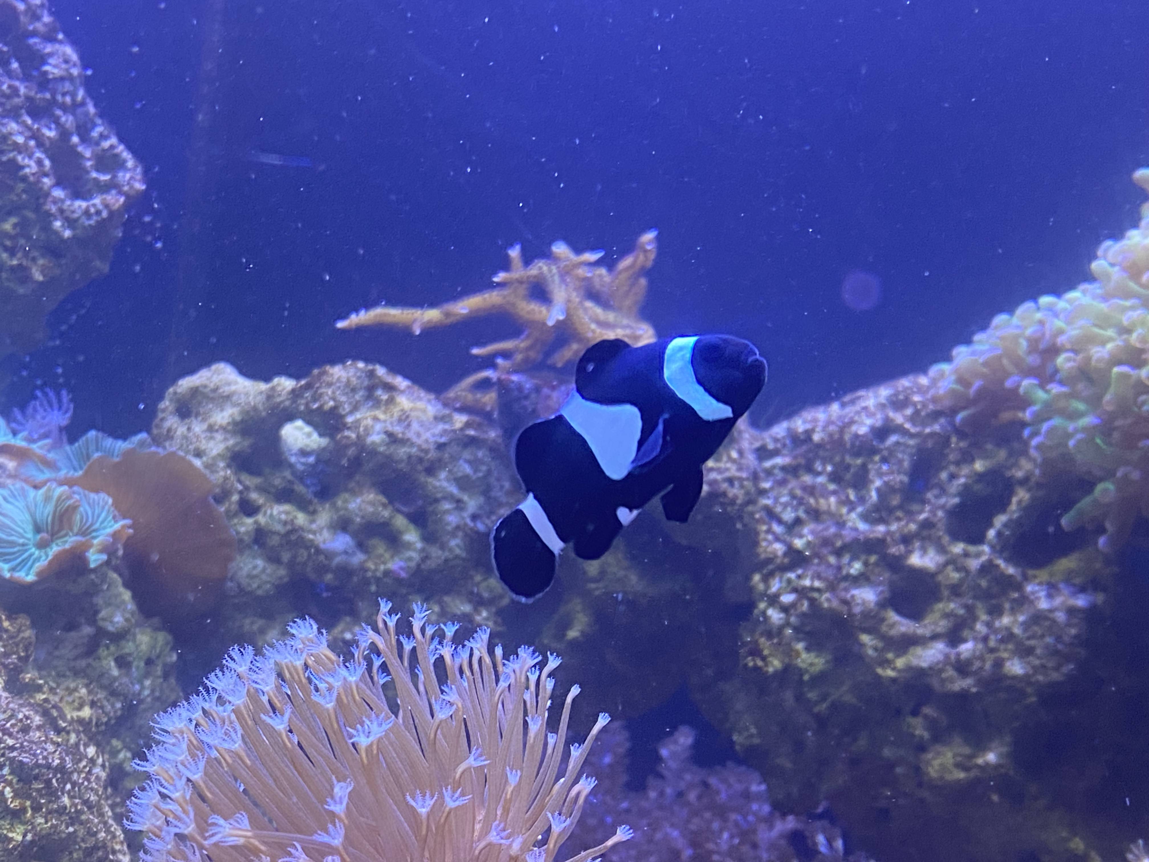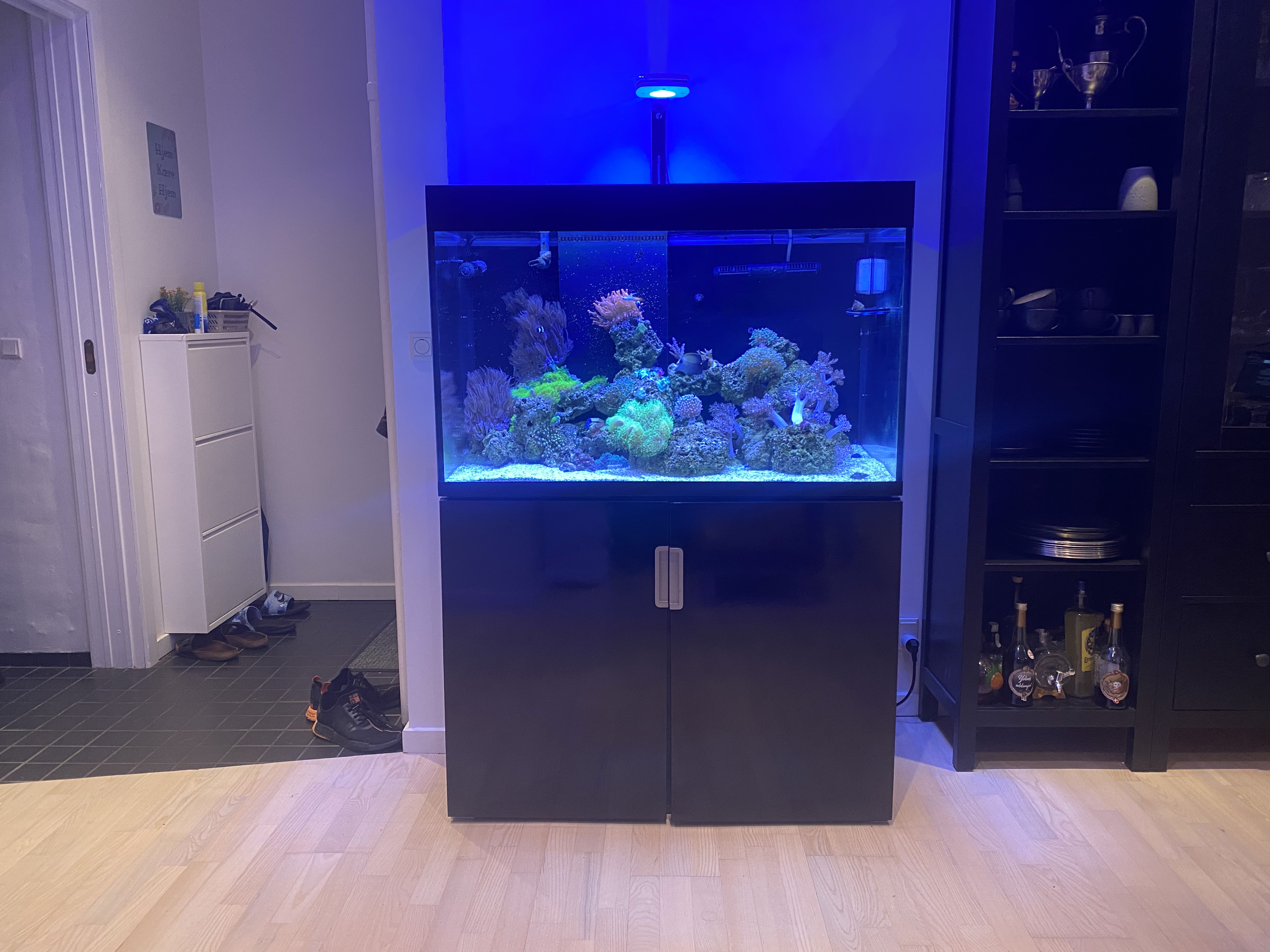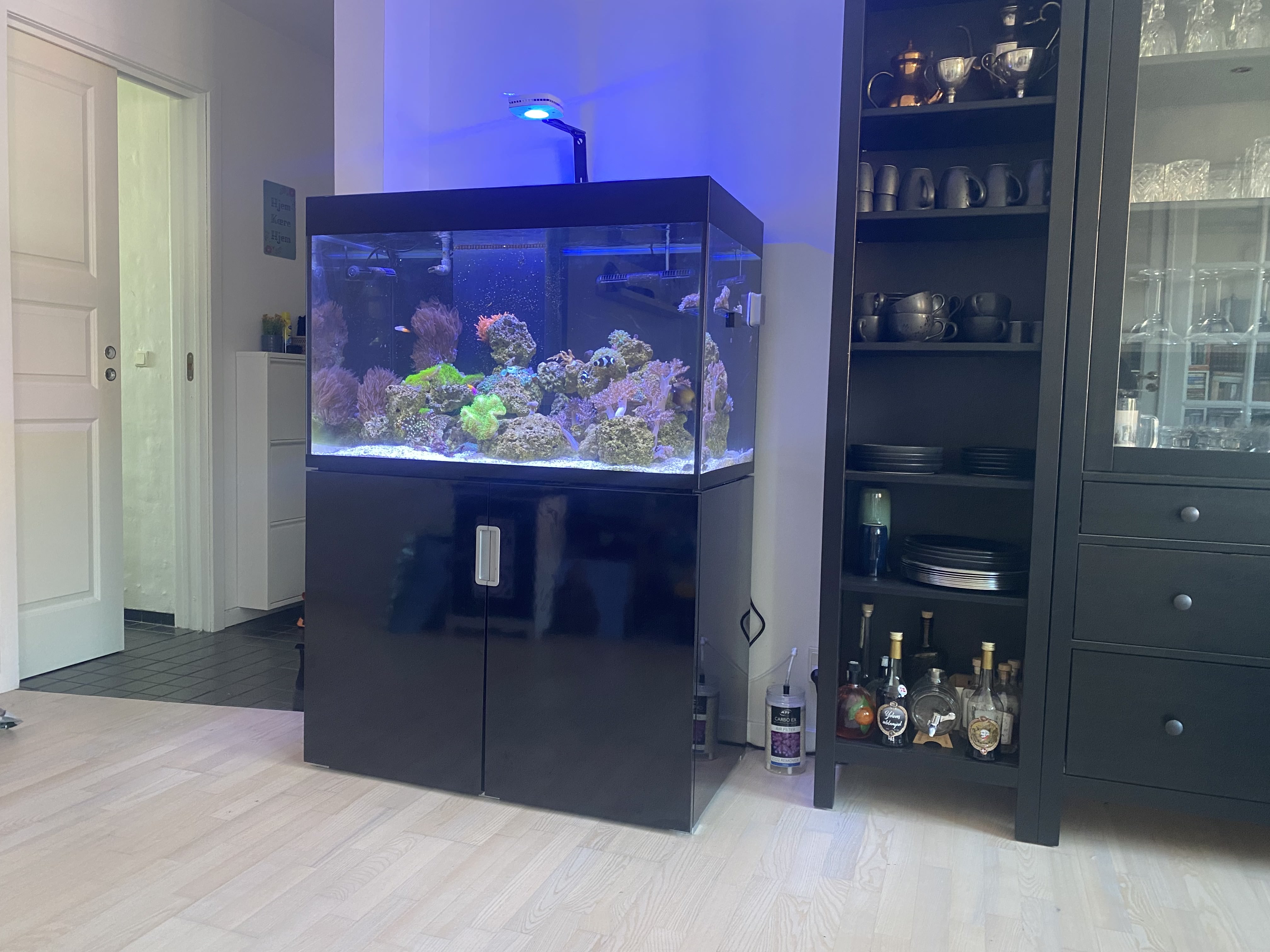 Displaytanken Dette akvarie er et Eheim Incpiria 300 marine akvarie som jeg købte brugt i januar 2023. Jeg har selv lavet det fra gråt til sort og ellers lavet små detaljer så det blev lidt mere nice, og jeg ikke havde de samme frustrationer som jeg havde ved mit gamle. Såsom plade som skjuler alle kabler og har controllere monteret.