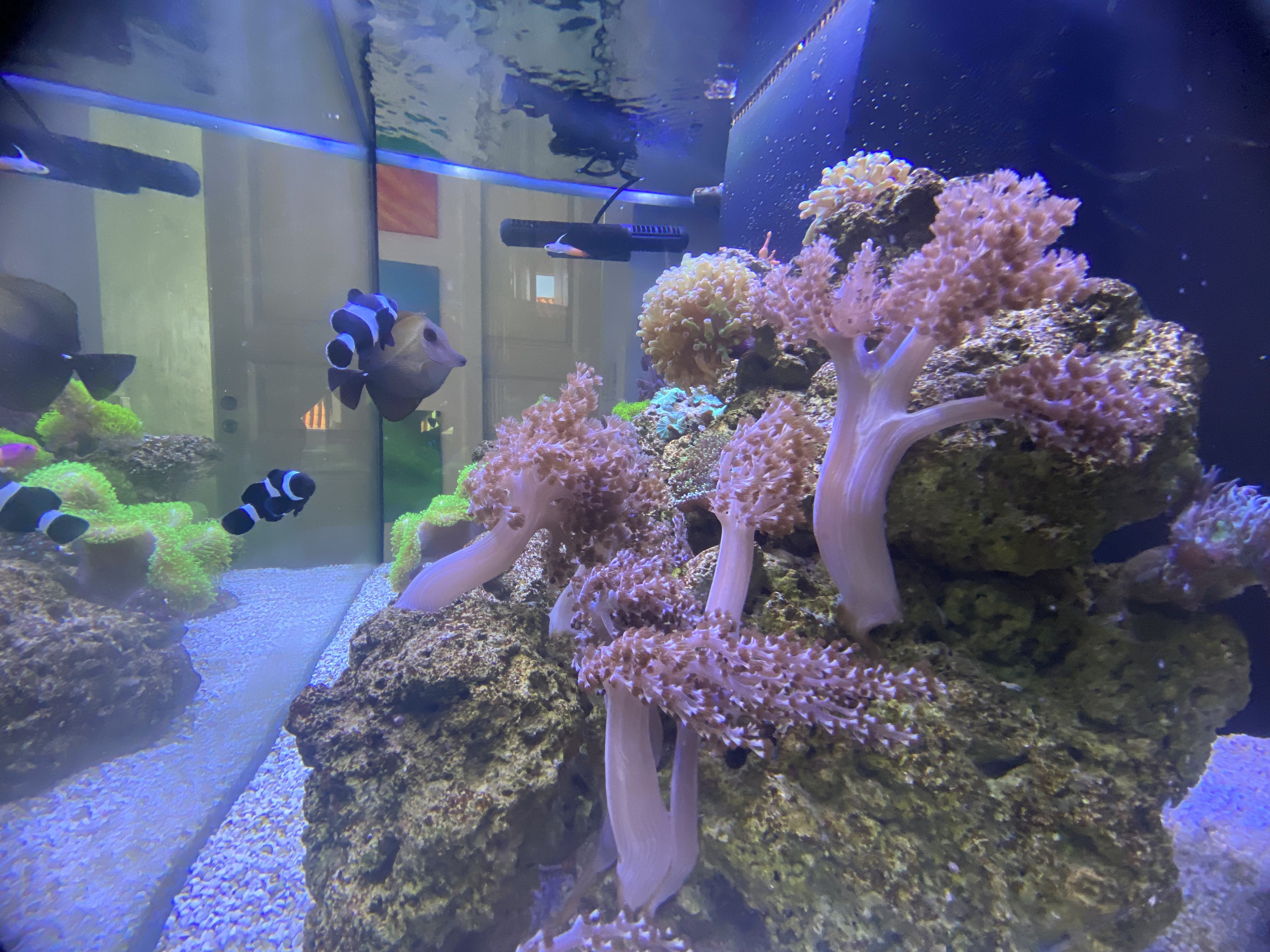 Det gik rigtig fint af et første forsøg med saltvand, og jeg havde mest problemer med nitrat og fosfat, men fik senere mere styr på det med lidt VSV vodka dosering og mere faste vandskift. Det bestod primært af en del bløde koraler (Stor koloni af sinularia) og lidt forskelligt LPS og zoa. Af Fisk var der et par klovne, Orcide Dottyback og en Blennie.