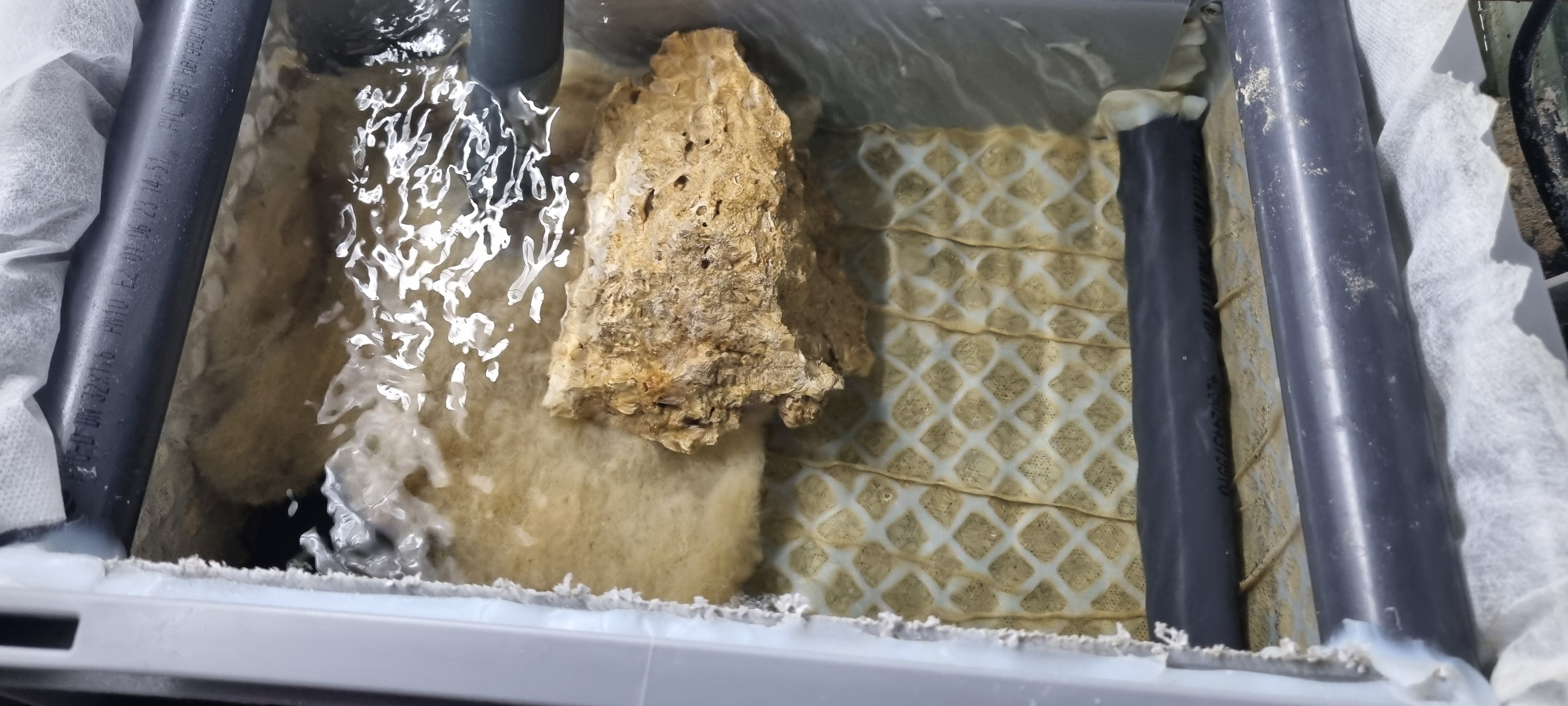 Sten og filtervat er for at strålen med 8000 liter vand flytter på fleecen.
