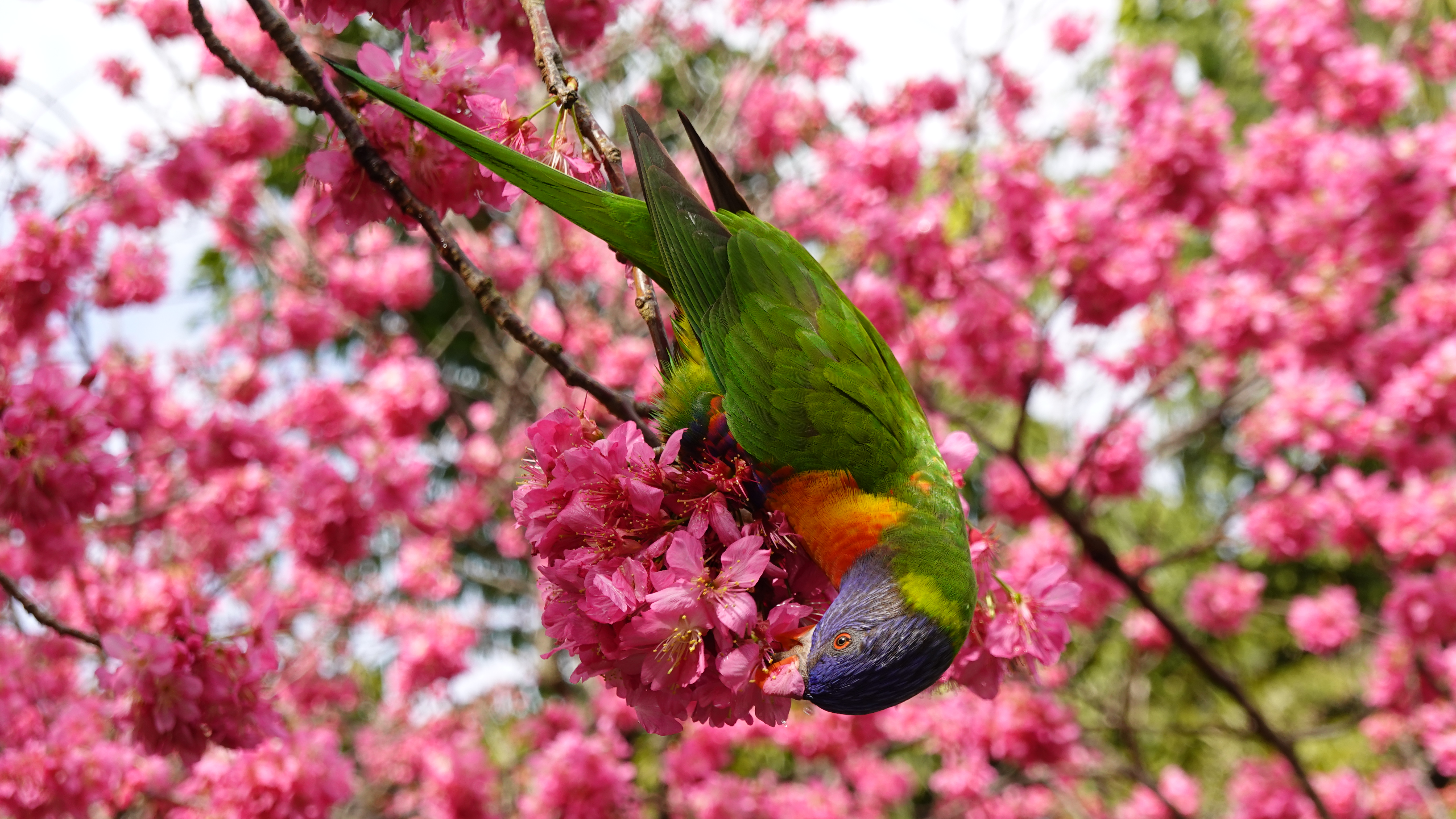 Bjerglori, som spiser japansk kirsebærblomster i Sydneys botaniske have (hvor der pt. er vinter)