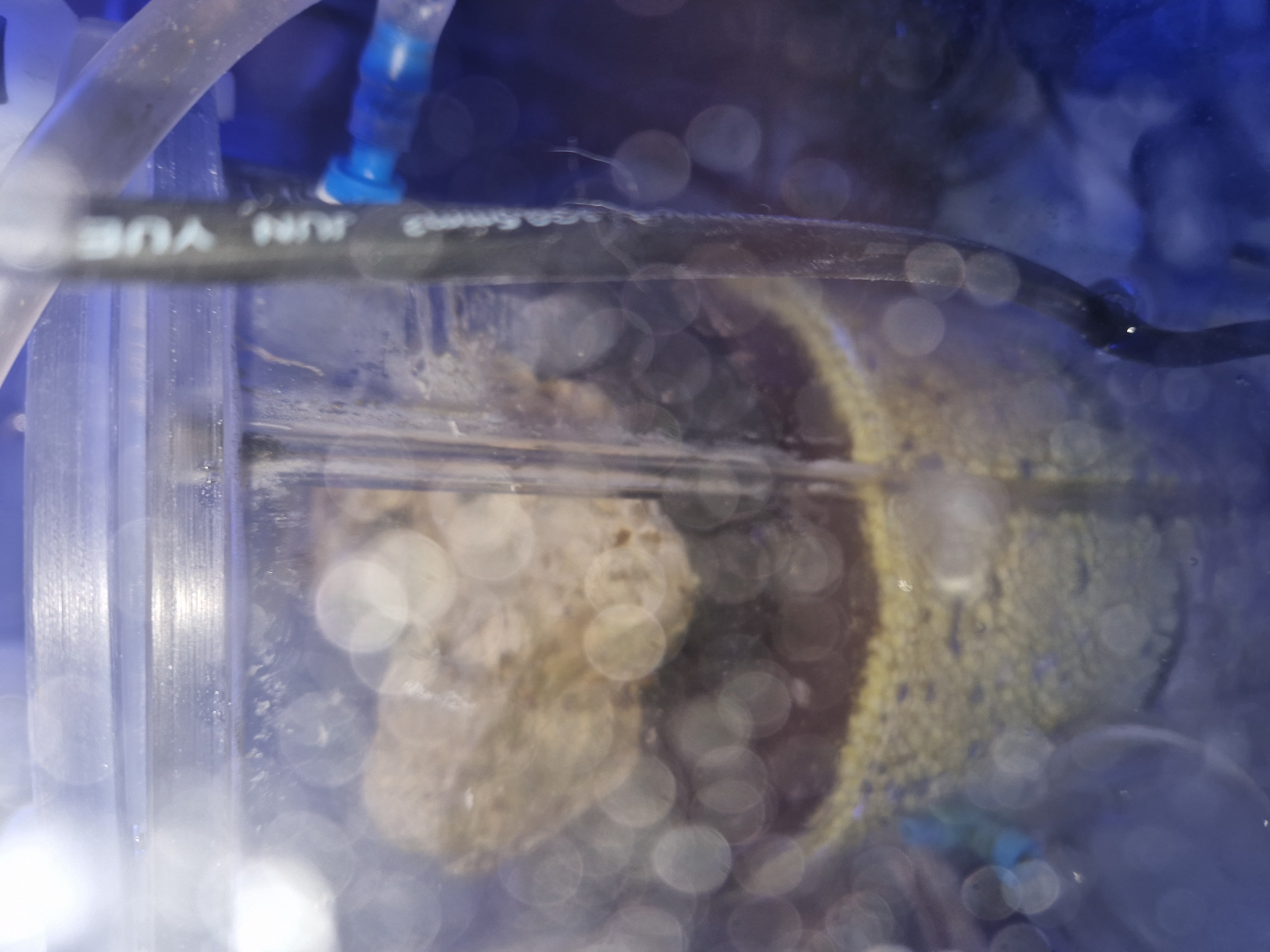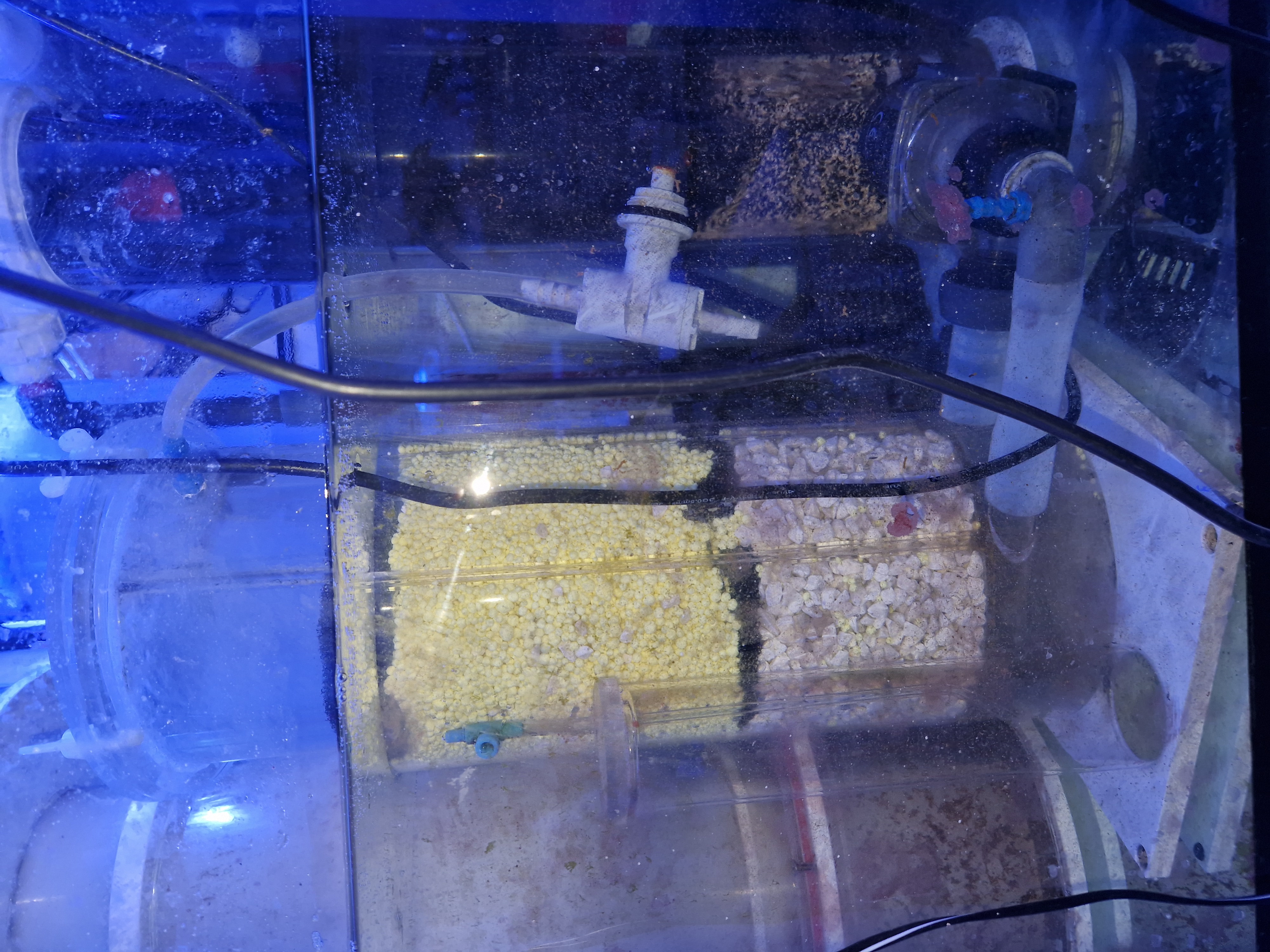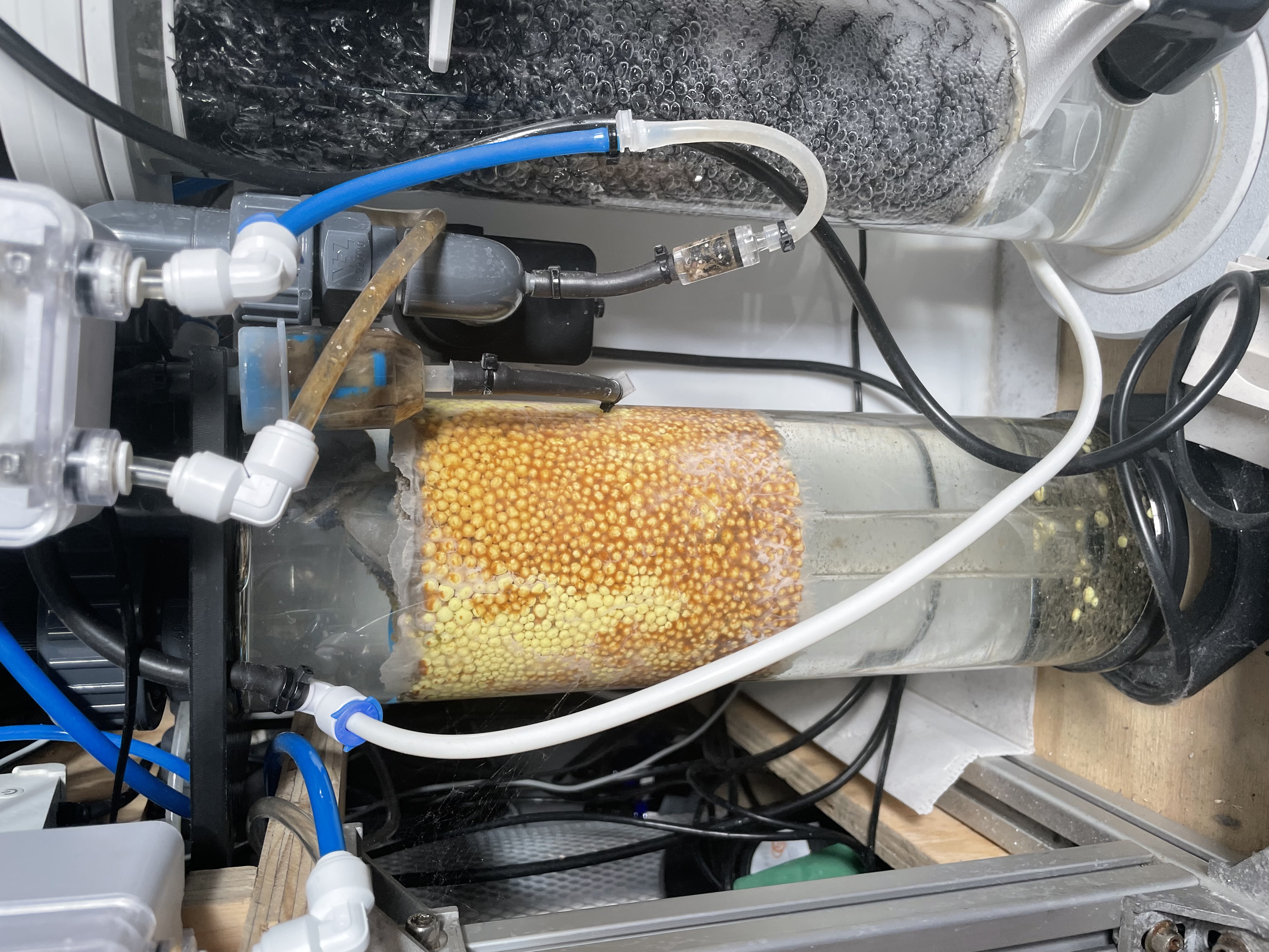 Der er for lidt flow på reaktoren så den har ramt 0 i nitrat og så begynder bakterierne at spise sig selv det vil kun blive værer og slannger stopper til på udgangen og man skal regulere hver dag pga det så der er kun en rensning af medie i vand og genstarte den kulturen dør så snart du åbner låget