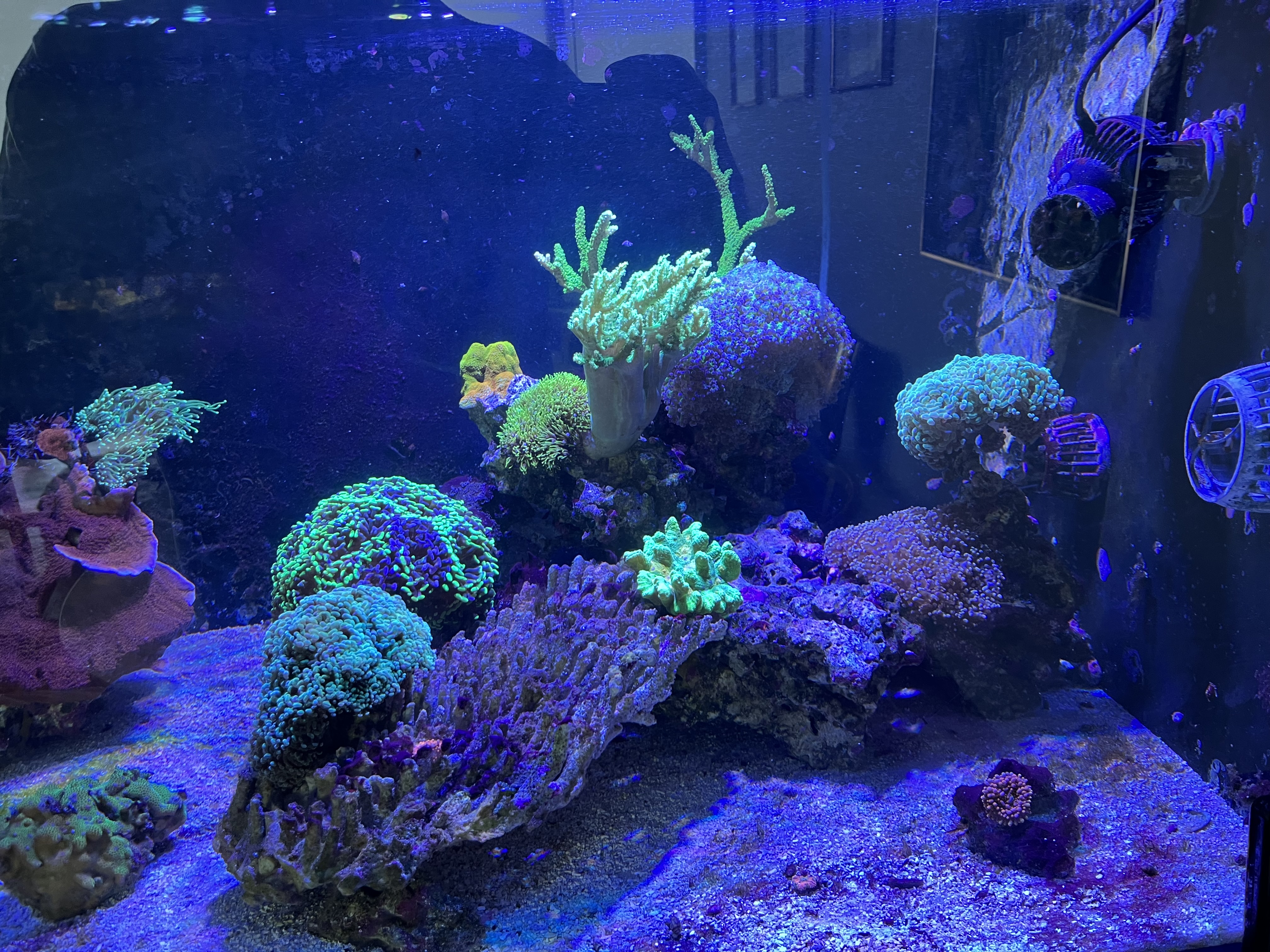 Akvariet med koraller/snegle/søpindsvin/pods osv får lov til at stå og køre videre UDEN fisk i, indtil 1 april. Så er alt garenteret sygdomsfrit. Korallerne står pisse flot for tiden 👍🏼