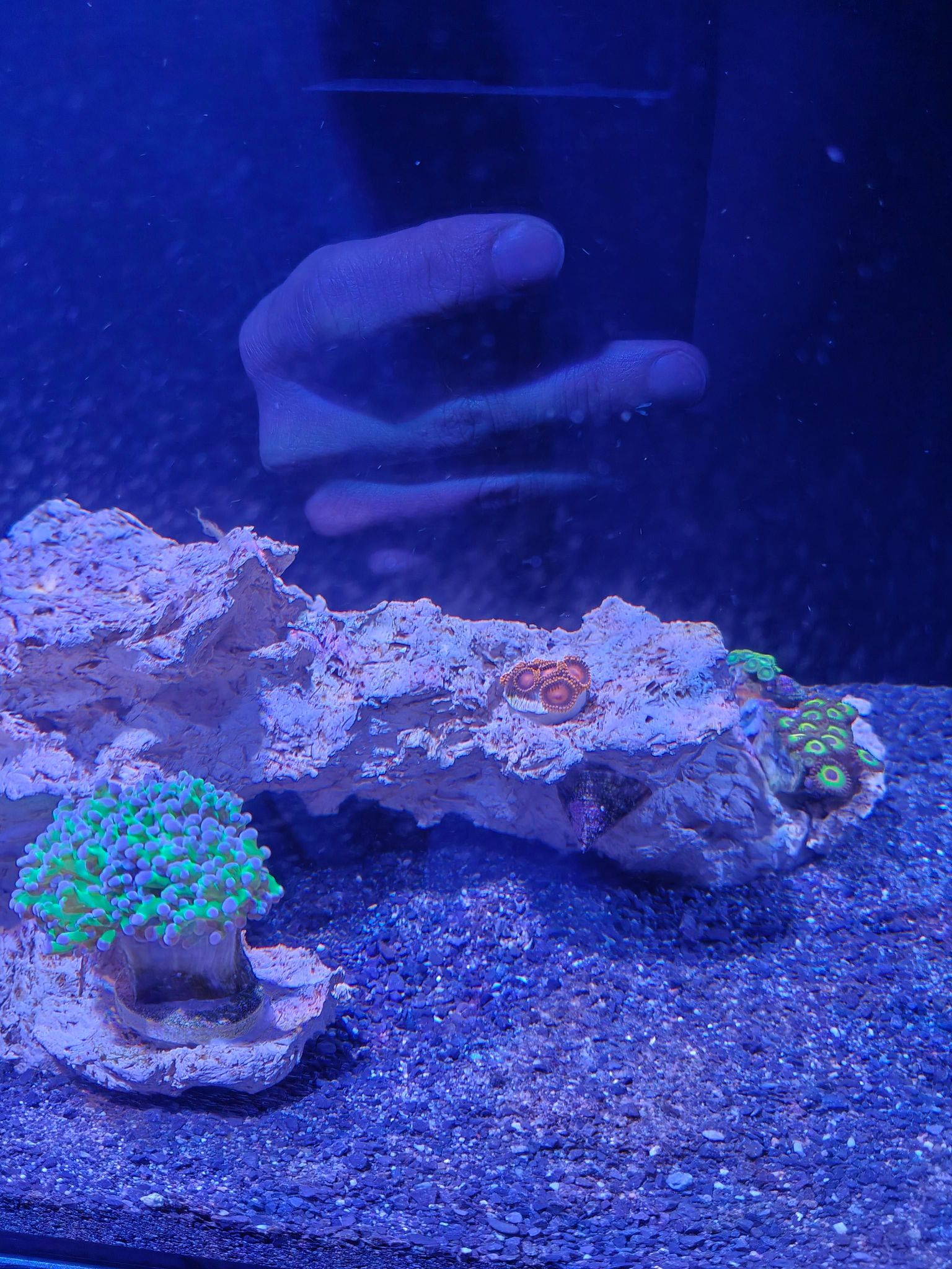 Euphyllia, Blasto, sarcophyton og 3x zoa. Alt trives. Kun Sarcoen er sur efter det første vandskift for en uge siden.