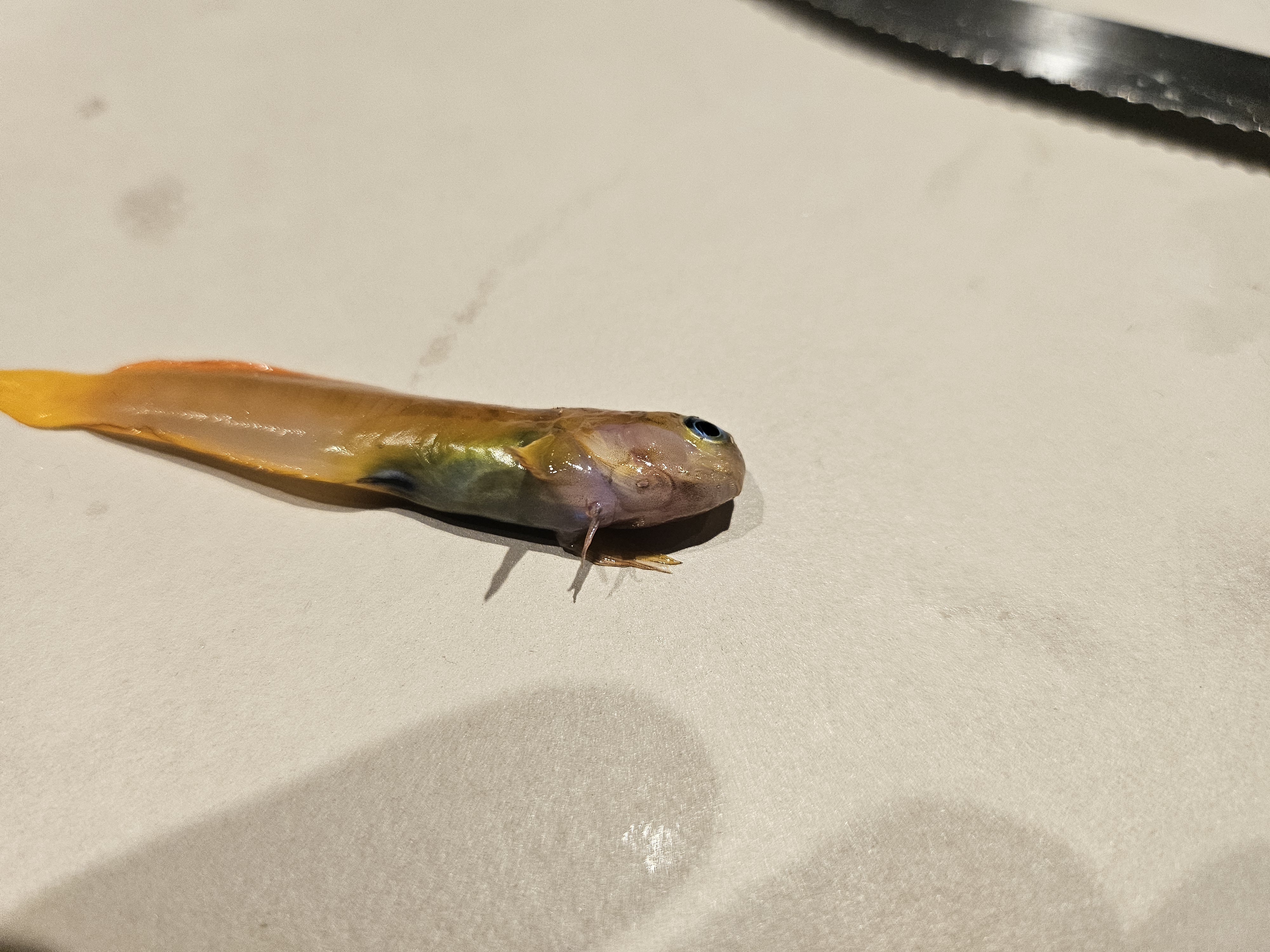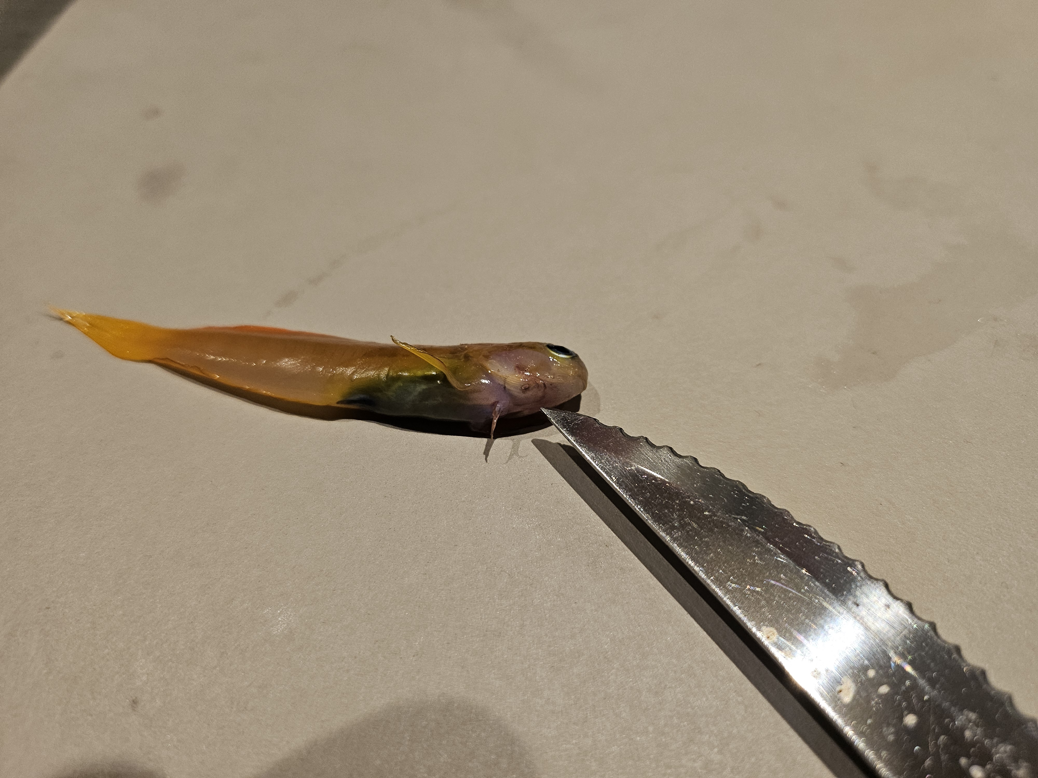 Den har sådan et lille stikhul lige ved det ene gælde låg som har en ring omkring sig hvor farven på fisken er lidt mindre farvestrålende. Det er den andet slim fisk jeg mister sådan her. Den første havde bare stiksåret ned på kroppen omkring rygsøjlen. Det var så lidt længere omkring 3 mm langt og lignede den var stykket med en kniv. Og virkede også paralyseret af stikket til den tilsidst døde. Altså sådan bare ligge på bunden med meget langsom vejr trækning. Jeg tænkte enlig bare den havde været uheldig og havde fået et dask af en kirug.