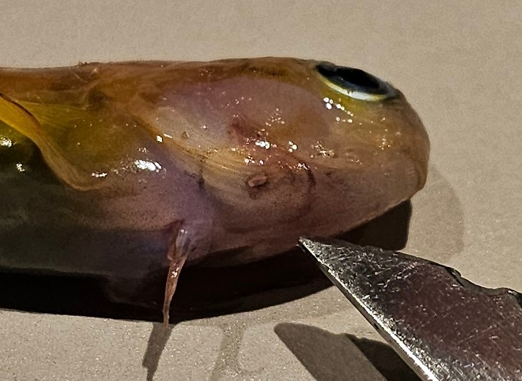 Jeg har også to chromis i baljen som stadig svømmer glade rundt ville de ikke også være ramt hvis det var tilfældet? Og det lille stik sår er gået igennem gælle låget så der var hul hele vejen igennem. Det samme med den første der var såret også ret dybt?
