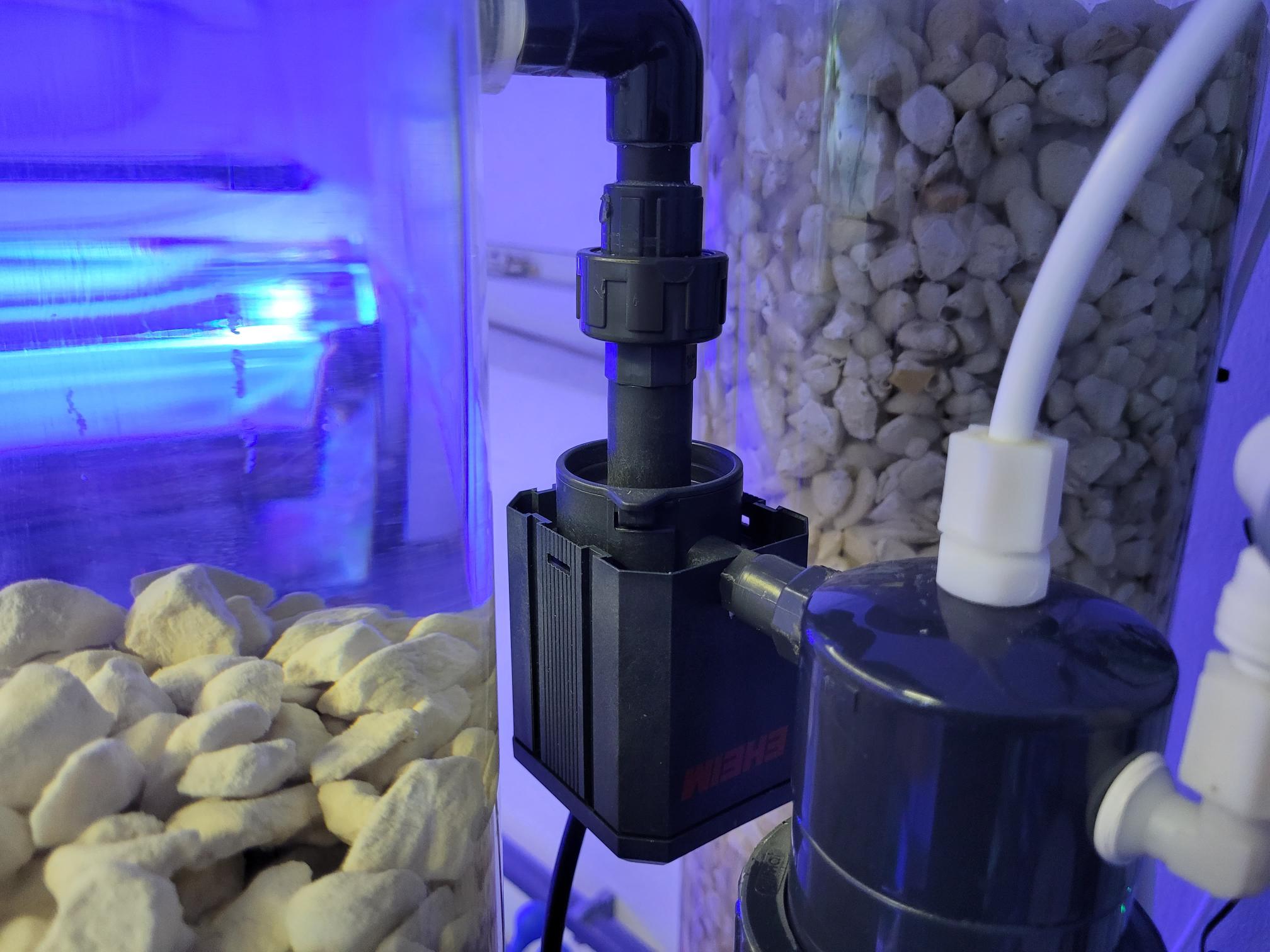 Eheim pumpens tilslutning til reaktoren. Noget er limet, men den kan demonteres. Man skal bare være forsigtig og være god med teflontape