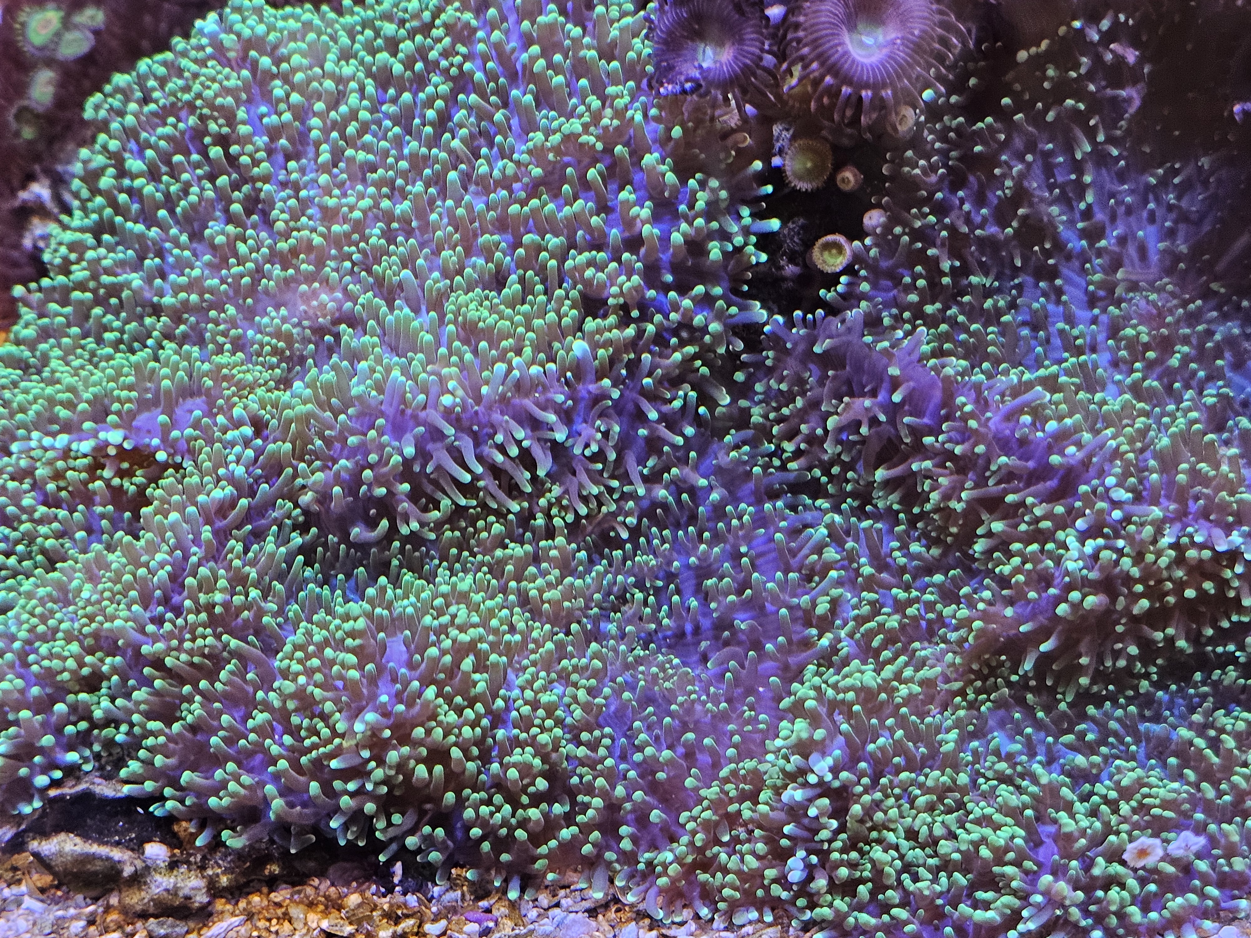 Koraller: Hammerkoral med mange hoveder, stor Porites stenkoral, meget grønne rhodactis skiver, stor lilla gorgonia, grønne zooa, lilla-brune knap-polypper, Kenya-træ mm.