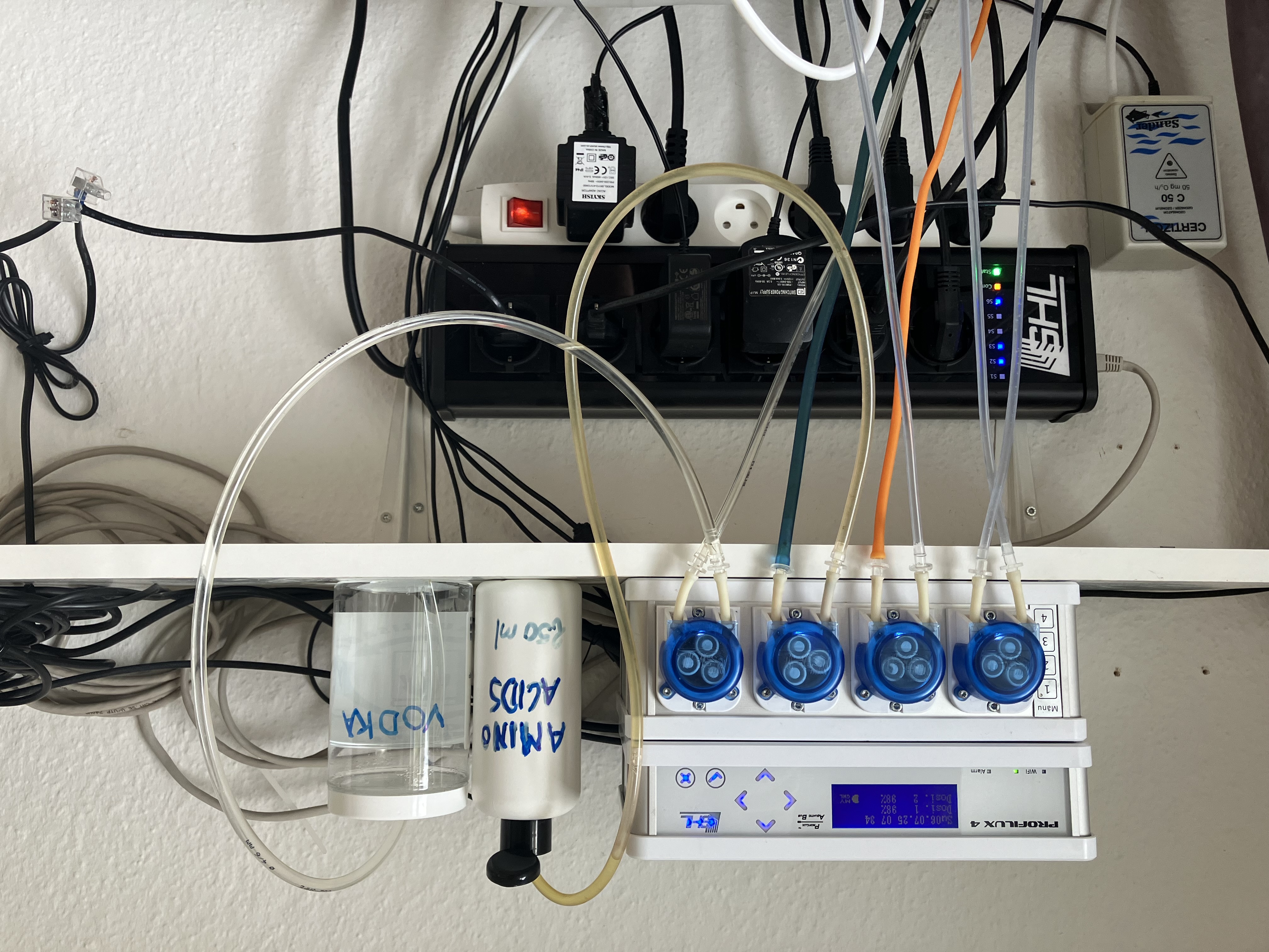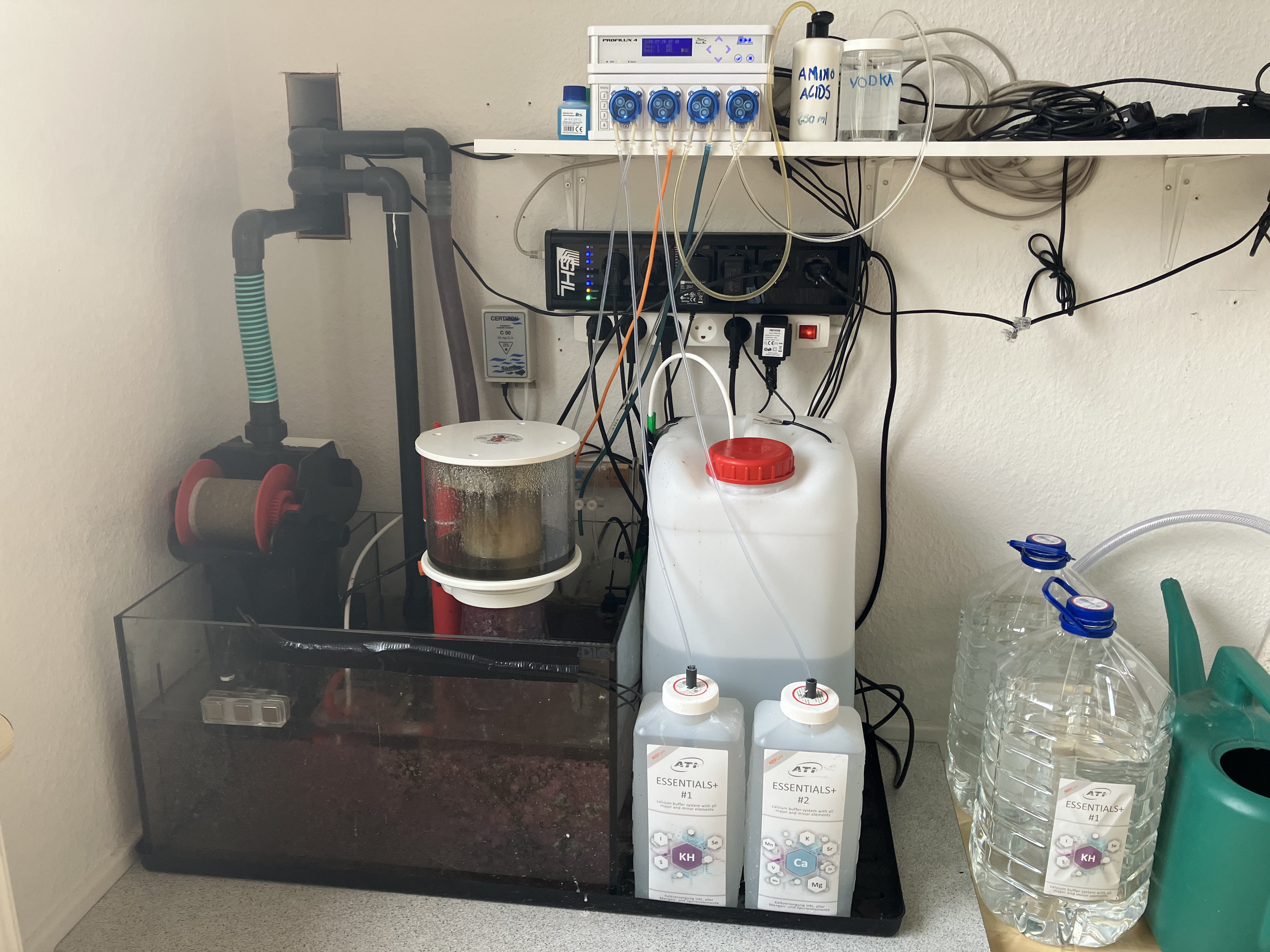 Er styret af Profilux'ens levelmåler og består af en 25 liters dunk ved siden af sumpen, med en lille pumpe i.