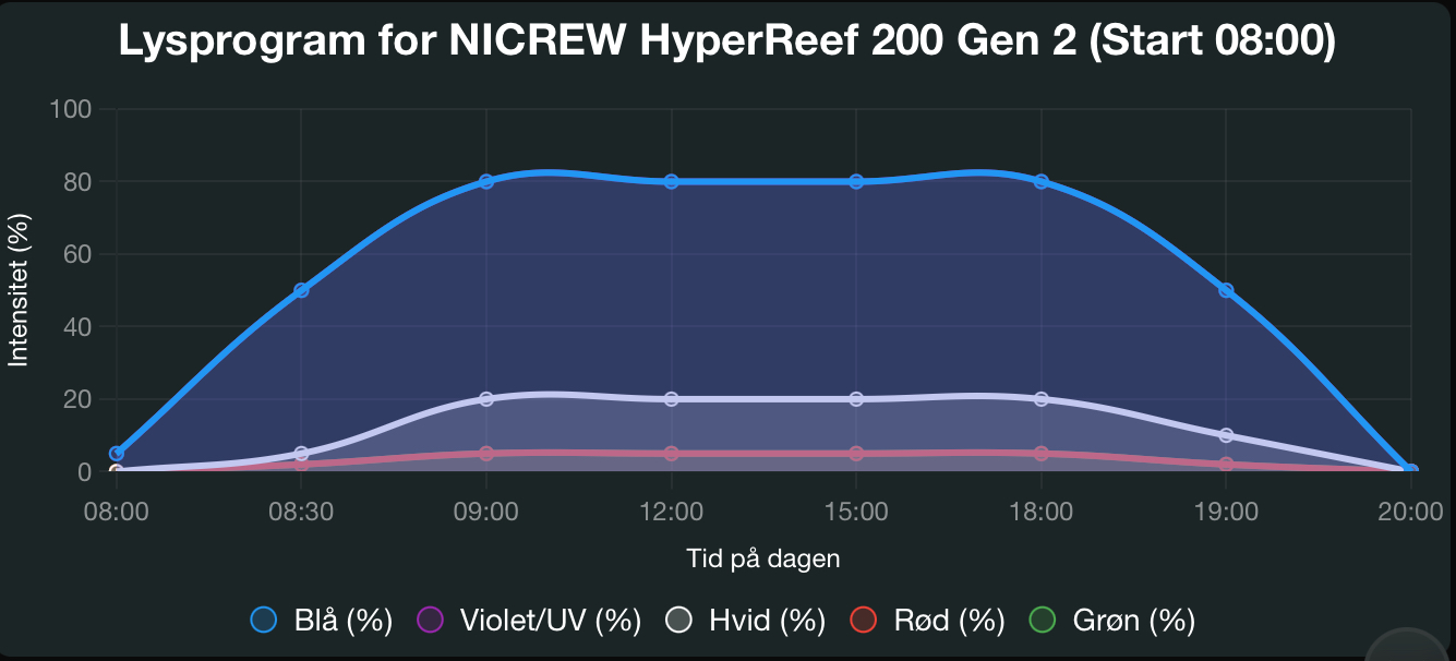Jeg begynder lyscyklussen kl. 08:00, og vil vise lysintensitet (%) for hver kanal (blå, violet/UV, hvid, rød, grøn) på NICREW HyperReef 200 Gen 2 over en 12-timers lyscyklus (08:00–20:00).
