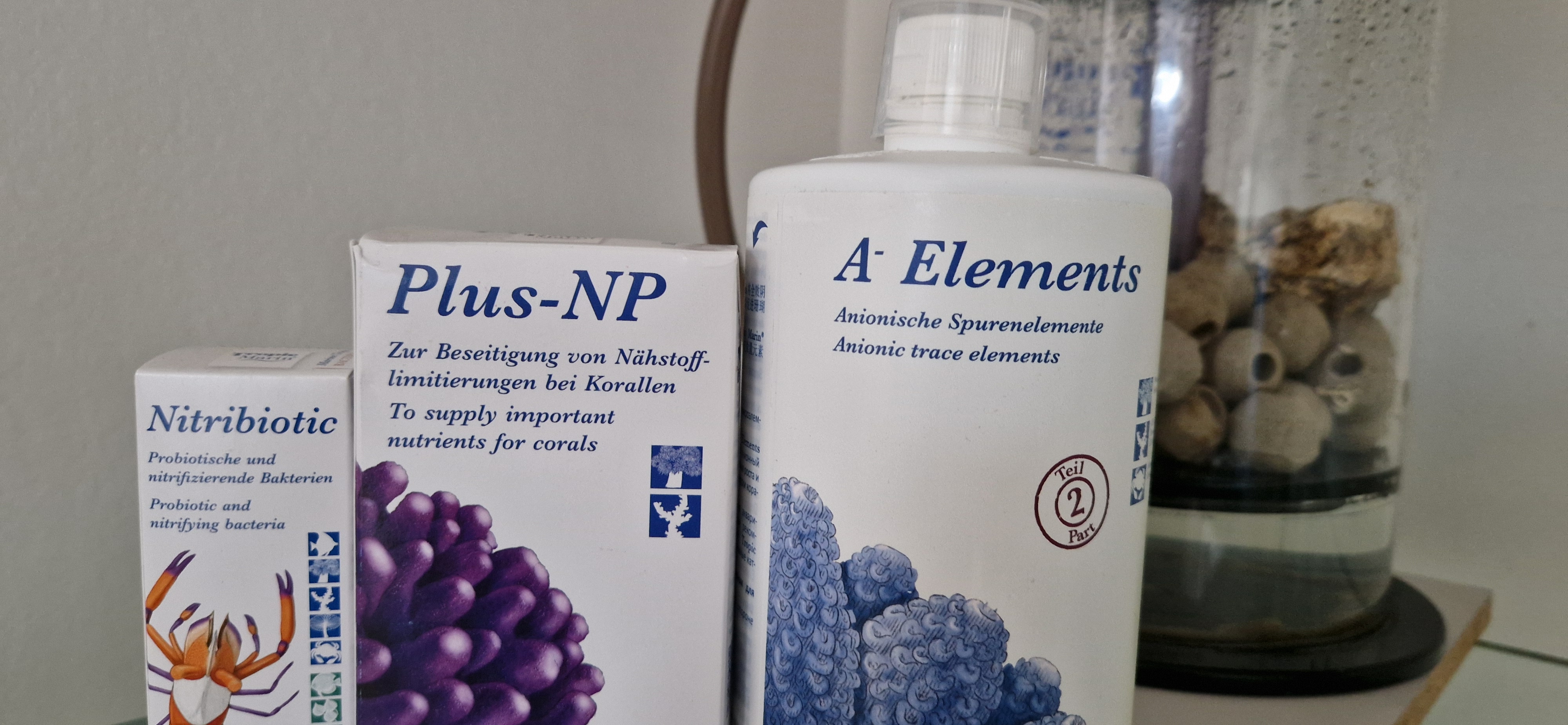 Så planen er at jeg doserer Nitribiotic en gang om ugen, PLUS-NP dagligt (lav dosis), A- Elements som sporstoffer (når lyset tændes skifter jeg til Phos-Start istedet for A-. Phos-Start booster mikrobiologi og kalkalger.