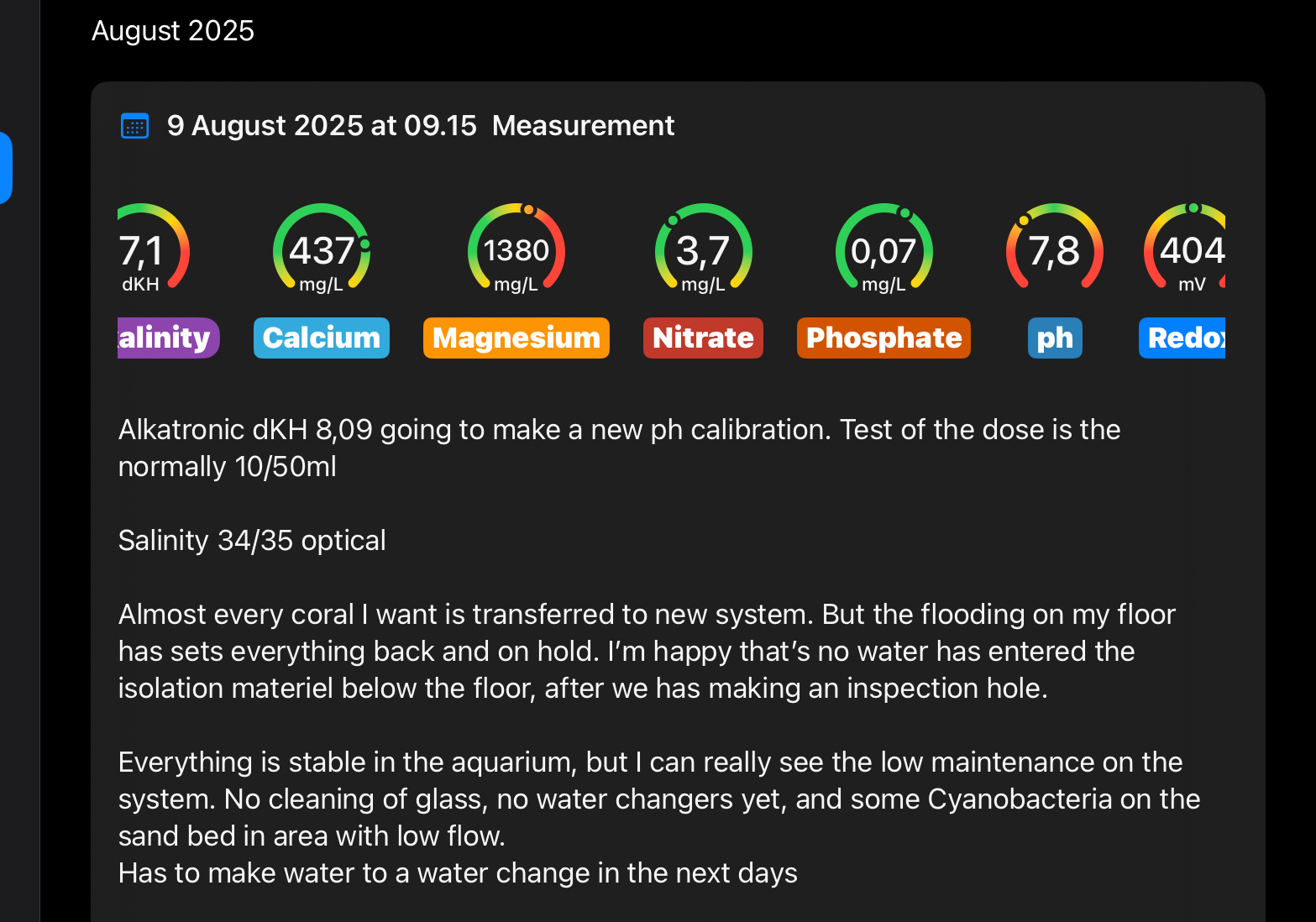 Der blevet lavet et 50% simuleret vandskift og har ikke siden opsætning tilføjet nogle former for sporstoffer. Så næsten 2 måneder uden daglige tilsætning af sporstoffer. Det overrasker mig meget, balancen er så god, at i bund og grund er vandskift næsten nok til at holde værdierne i skak, med få undtagelser som det vigtige jern, strontium osv.