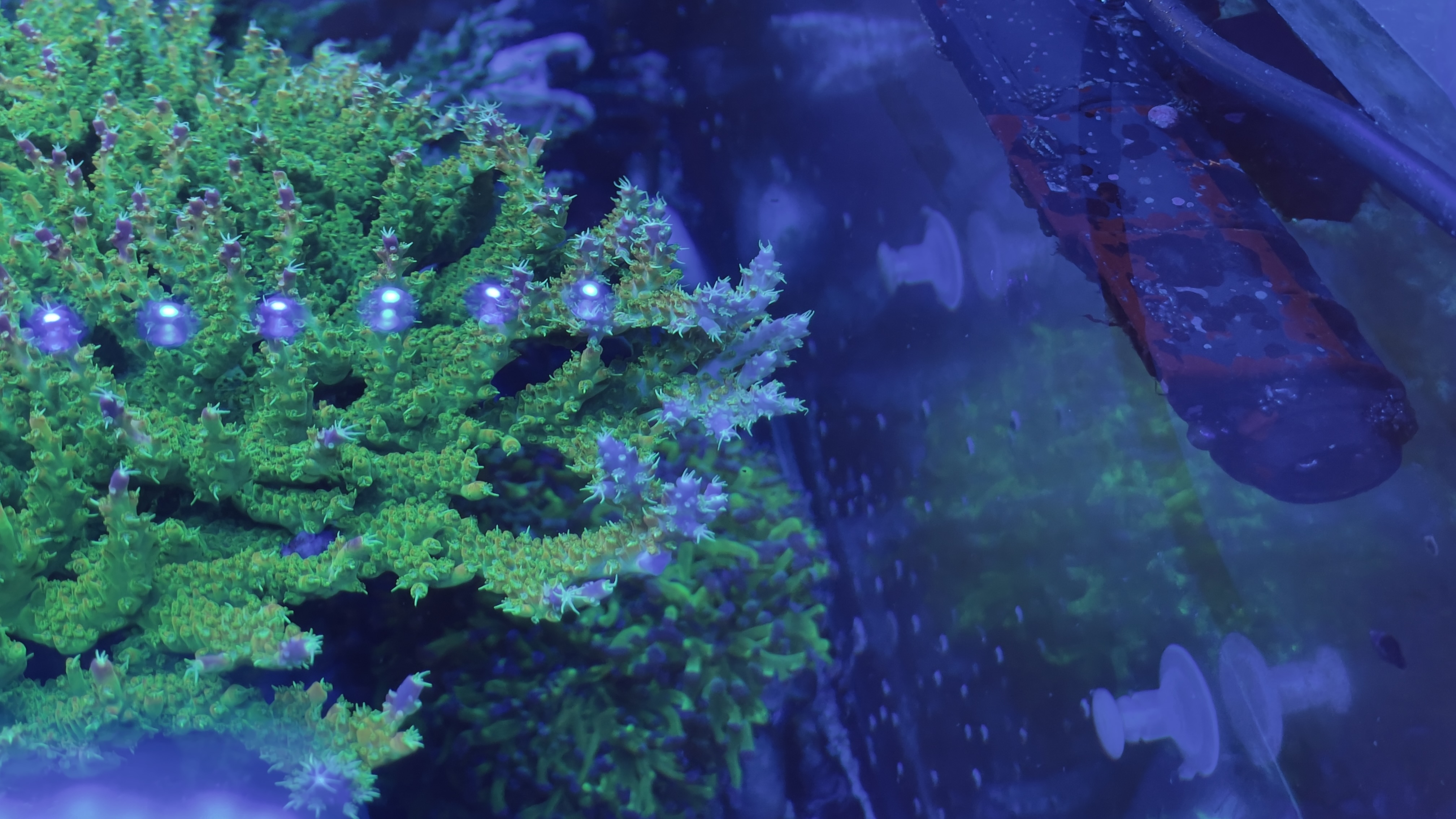 Acropora Microclados Sp “EC Red Devils” Fragmentet, koloni er i hovedakvariet
