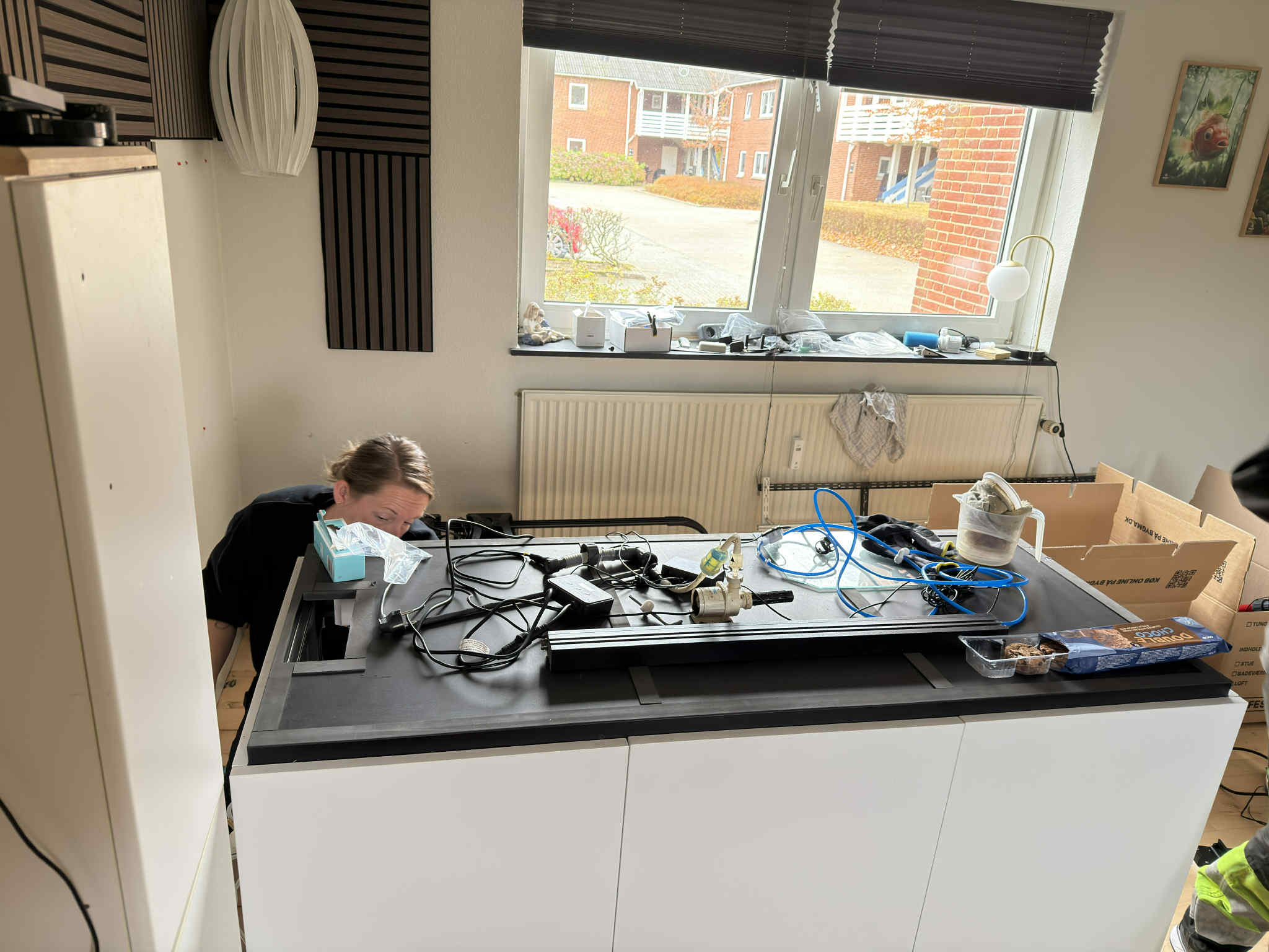 Log. Fodlister og silikone mangler og laves i morgen. Akvariet sættes på i morgen også når naboerne kommer hjem