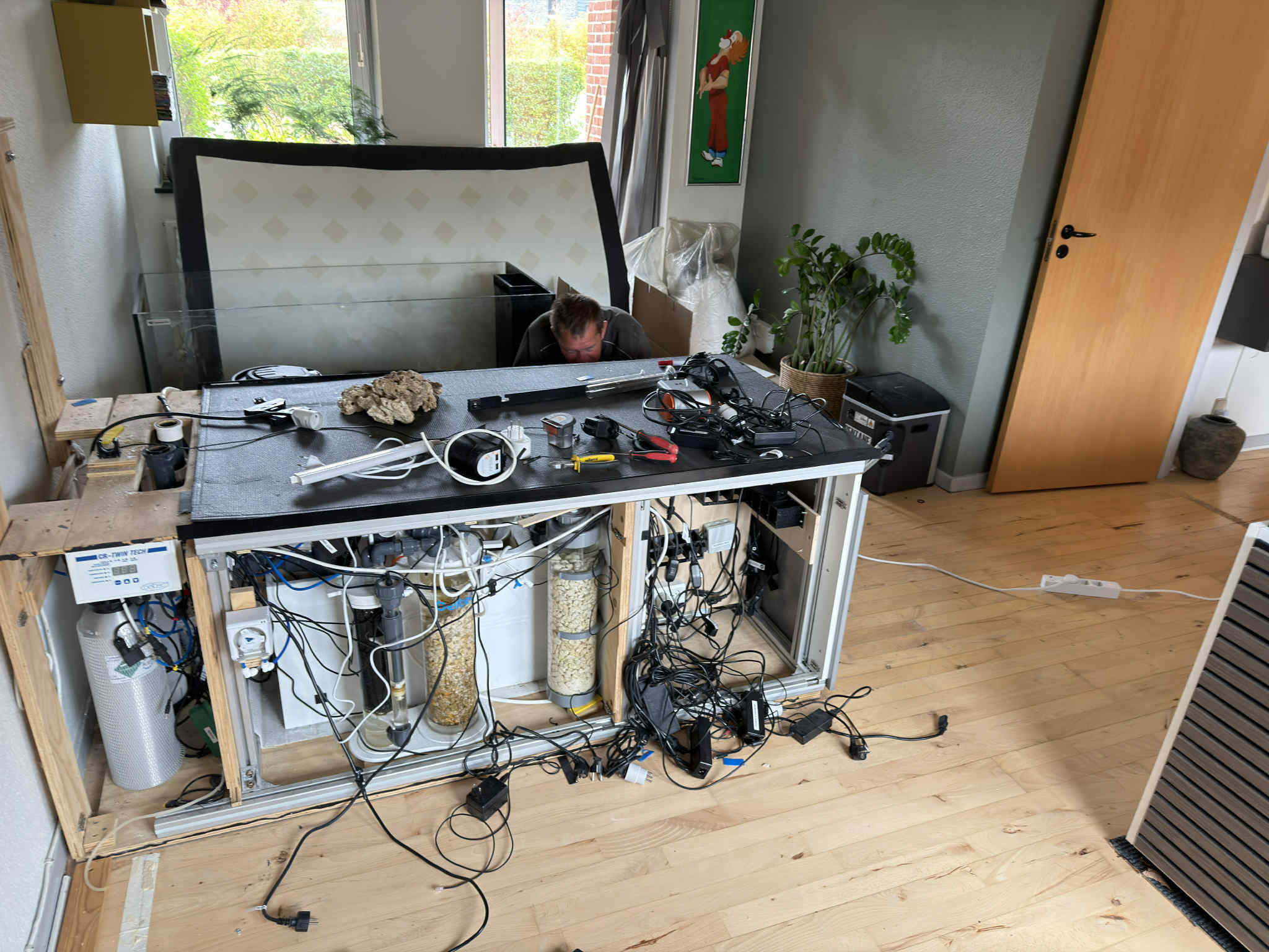 Alt er nu flyttet til det midlertidig akvarie. Der er ikke koblet meget på, men fik sat Alkatronic til at dosere for mig igen, så kh er stabil.