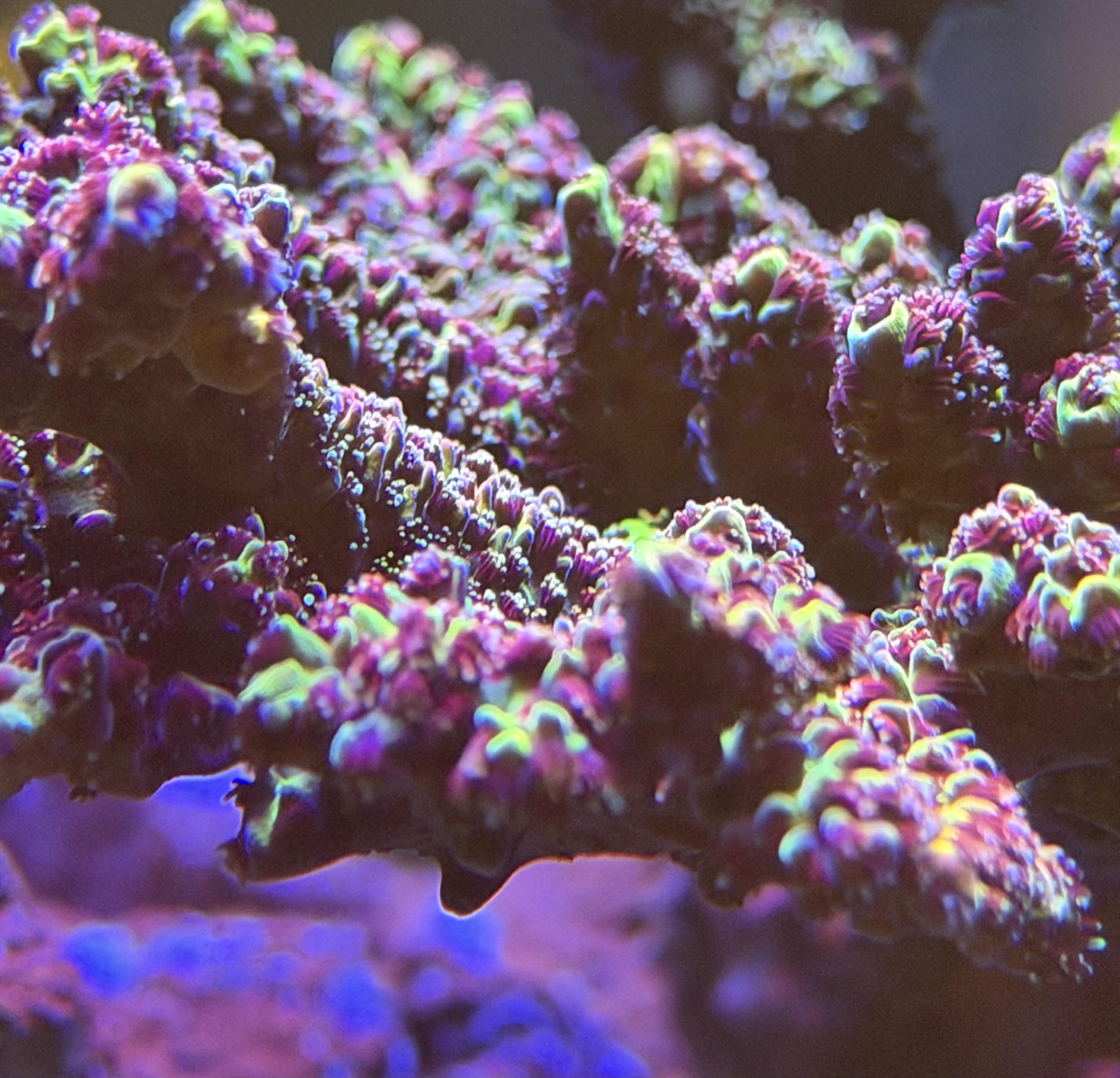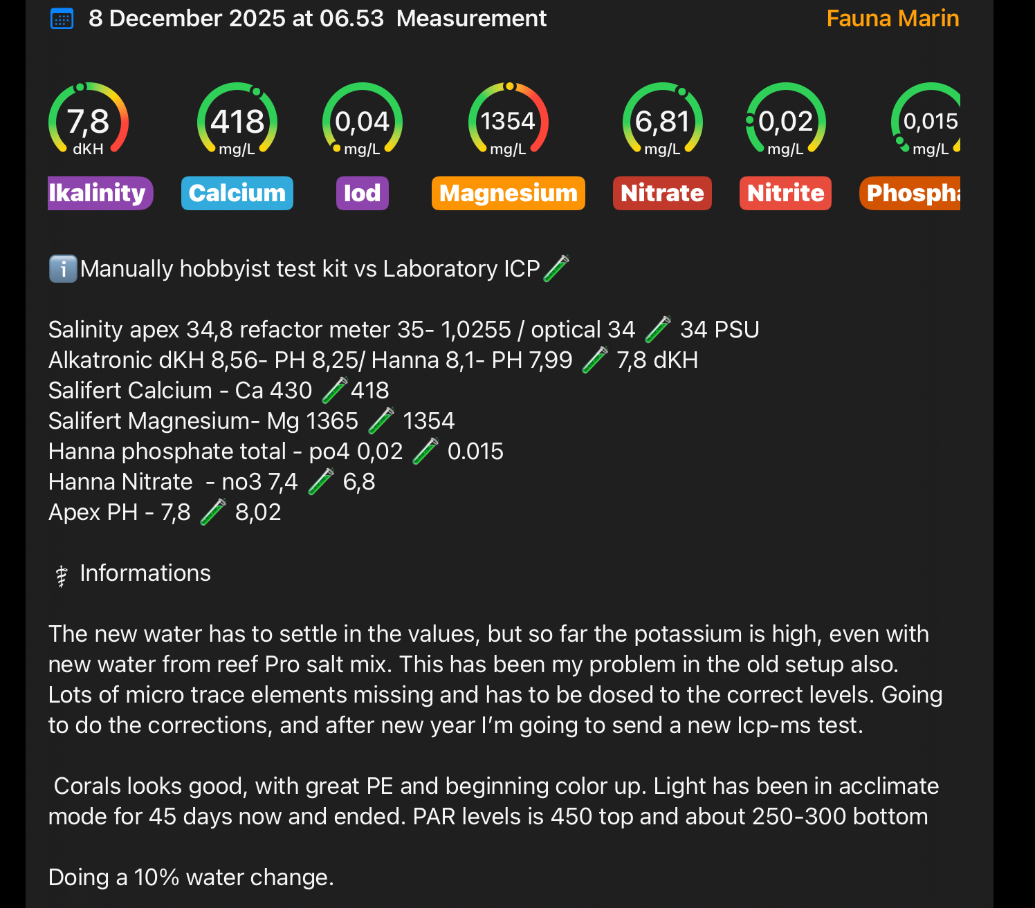 Gennemgået testen og laver nu de ændringer som er nødvendige. Der mangler en del sporstoffer, som skal justeres ind nu. Generelt står korallerne flot med god PE og ved at farve op. Lyset er som tidligere beskrevet i normalt drift nu, med par i 450 området. Vil se senere om den skal regulere op eller ned i forhold til at få de optimale farver frem