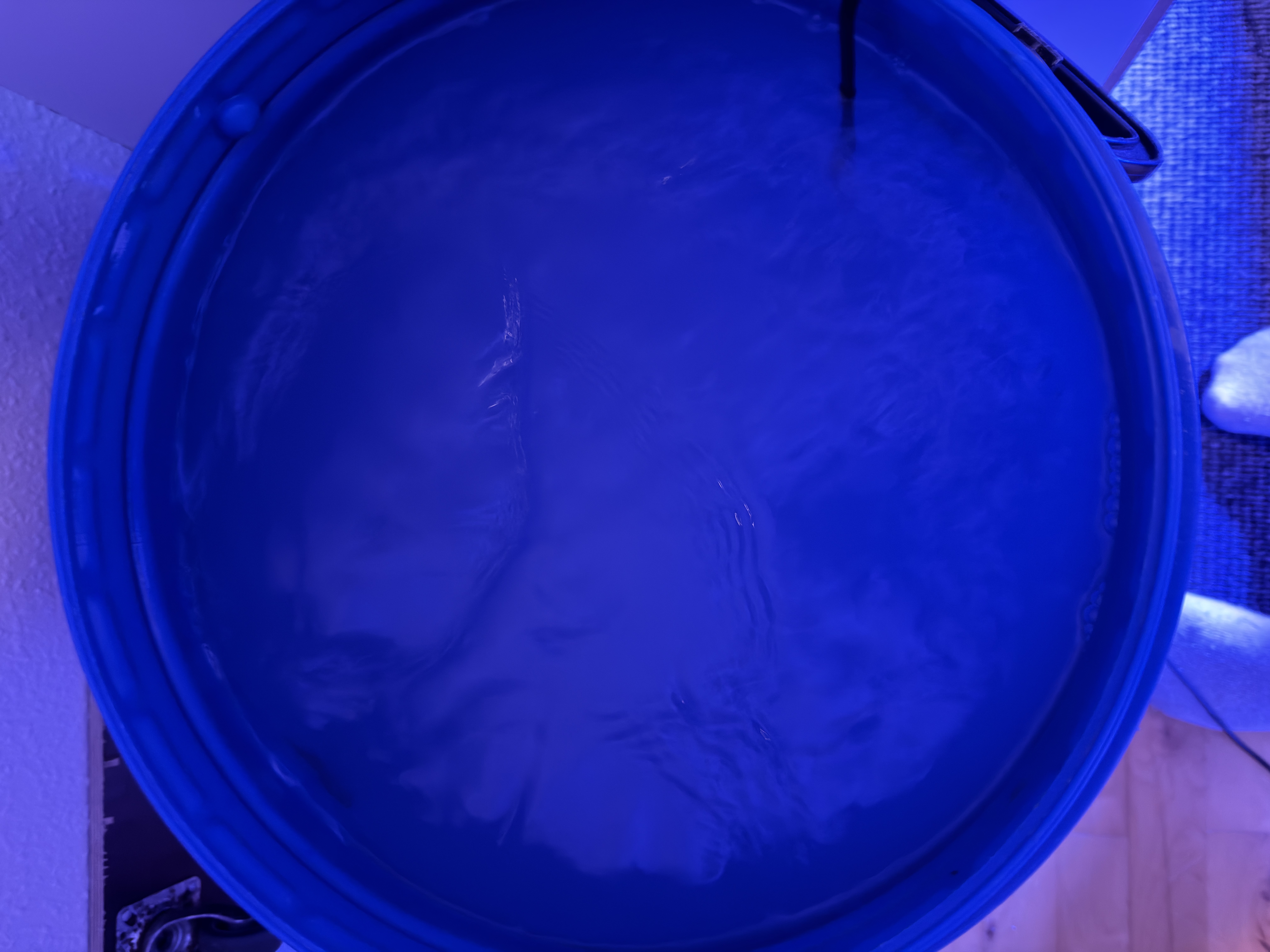 1 1/2 time efter opblandingen Her lige hældt salt i min 60l blå tønde. (Det er ikke helt 60 l kender faktisk ikke liter antal, da svømmeren jeg bruger til at stoppe fyldningen af ro vand sider samme sted hver gang, derfor altid har samme mænge og kan bare hælde mine 2440g i