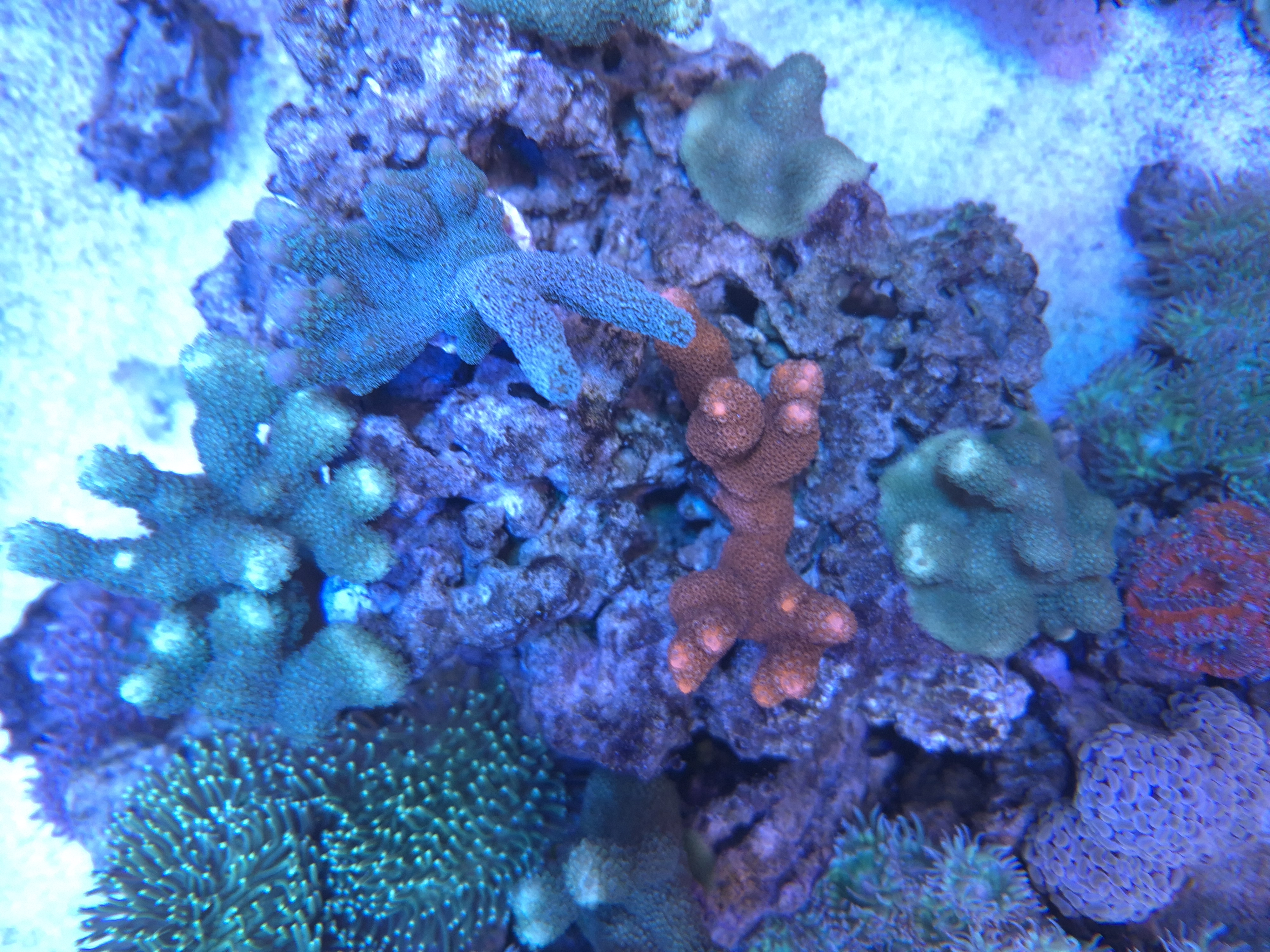 Mine små fragmenter af porites er vokset godt ud til flere grene og på et tidspunkt vil nogle af dem lave et virvar sammen med montipora rød og blå. Det bliver flot!