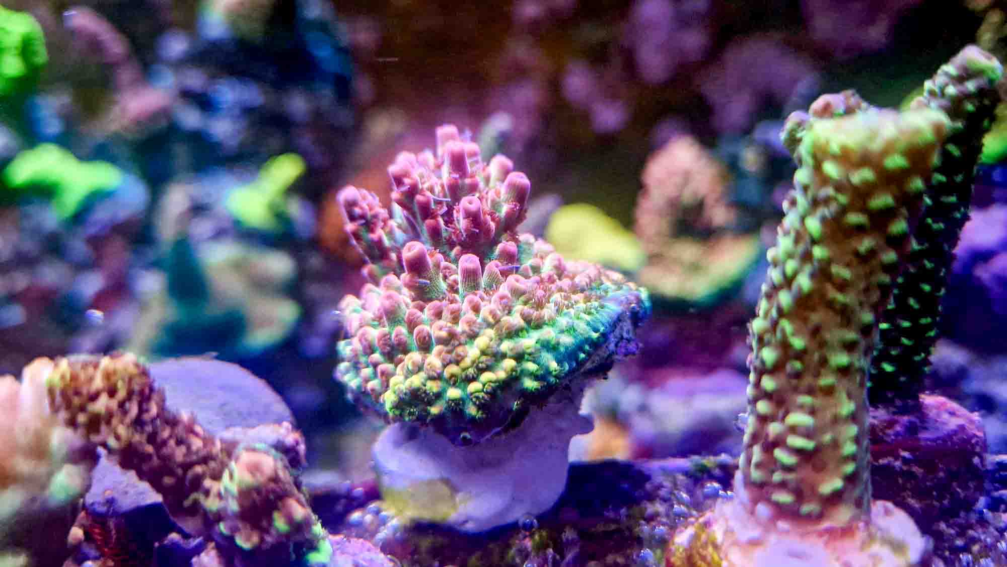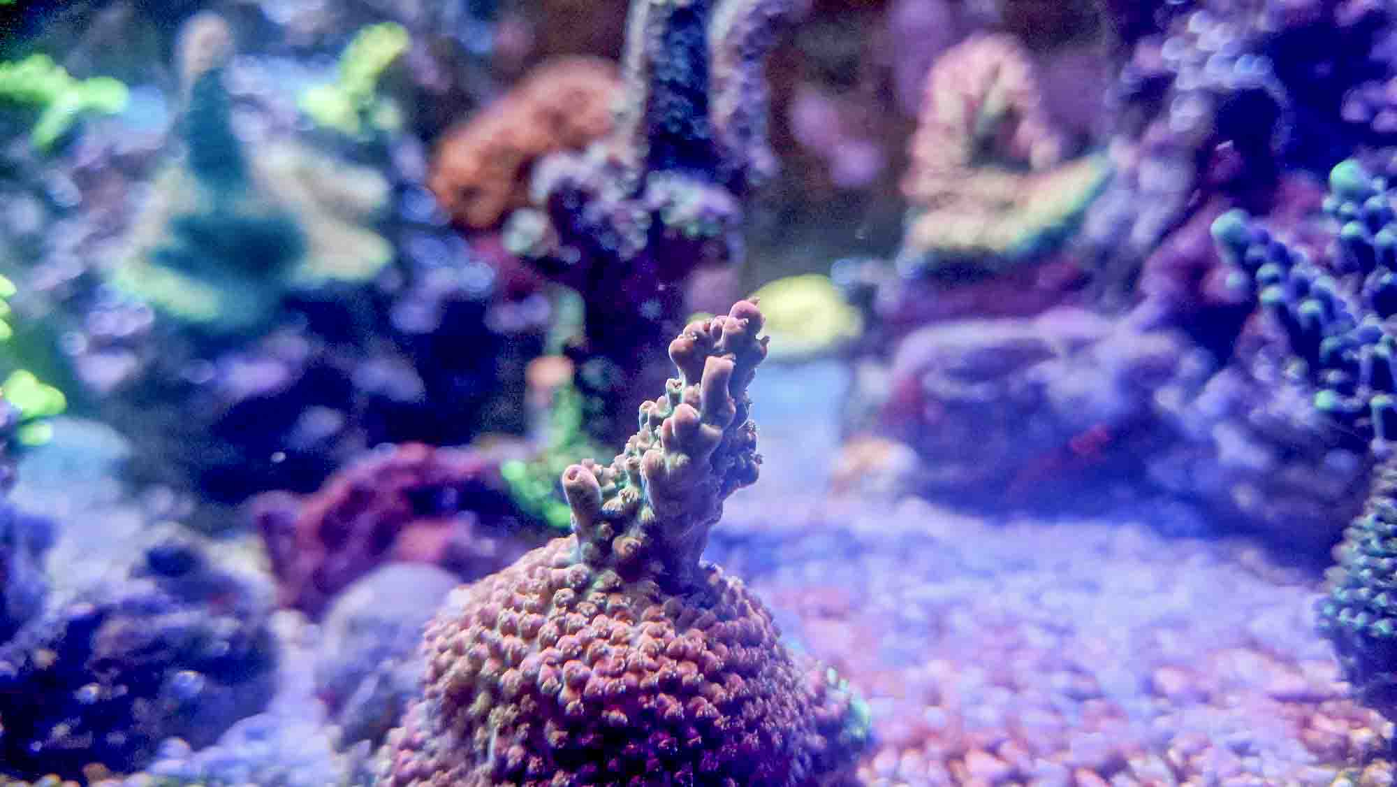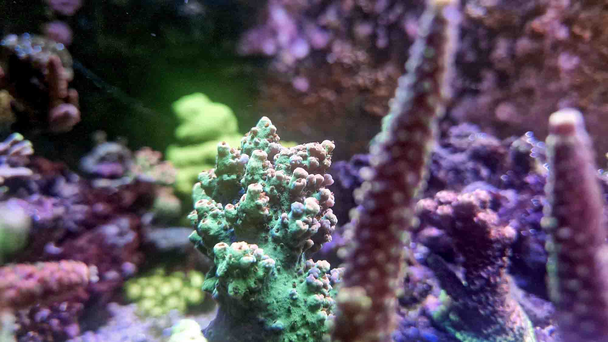 Status nu er, at det kører nogenlunde stabilt. Jeg mistede en del acro‑frags fra april til november, stort set efter samme mønster hver gang: begyndende alger ved foden, langsom fremmarch over nogle uger, og så gav dyret op. Et par LPS’er skrumpede også ind og opgav til sidst. Mine ICP‑tests så fine ud. Detaljerne er beskrevet i 2025‑tråden – den finder du her.