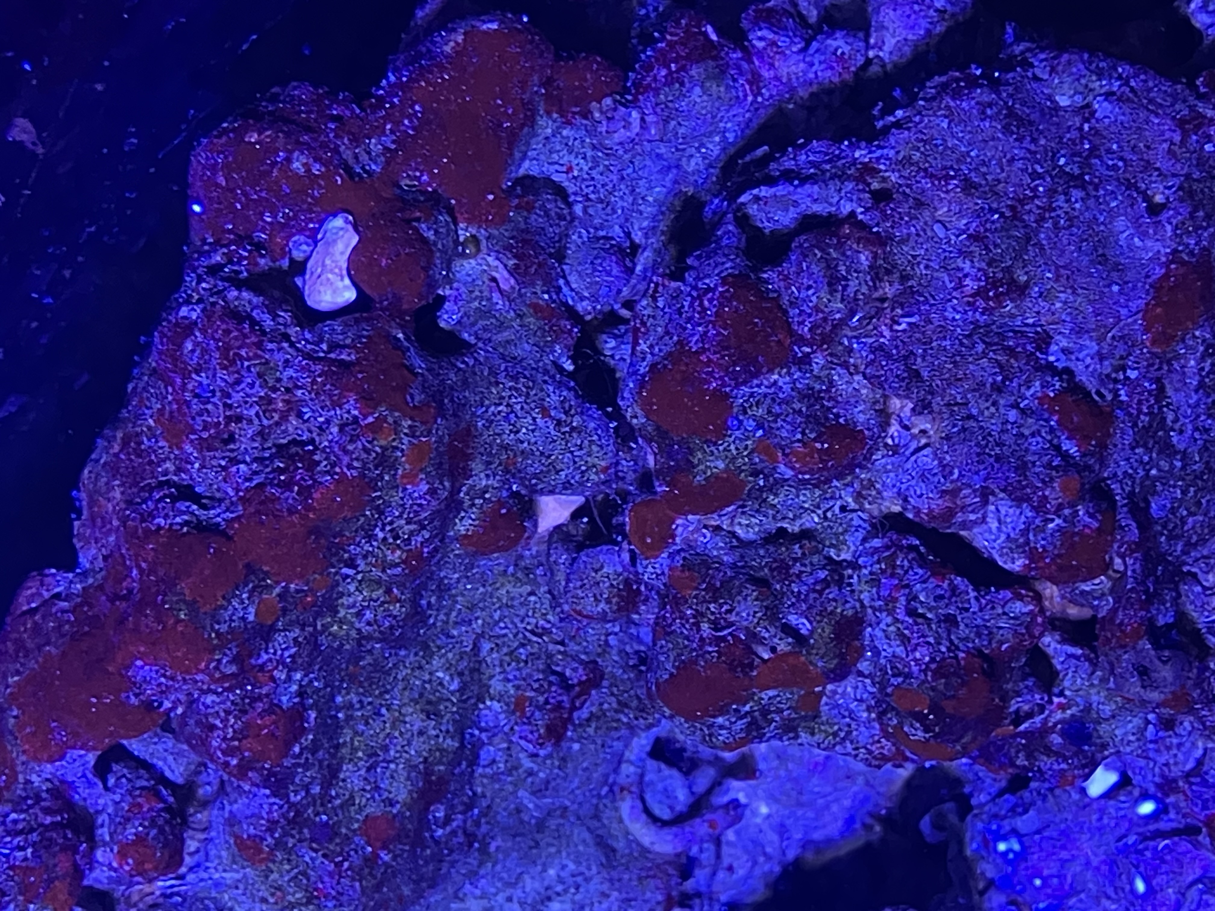 De røde kalkalger kan nogen gange være helt selvlysende at se på under blåt lys, og brækker af som kalkaflejringer hvis man prøver.