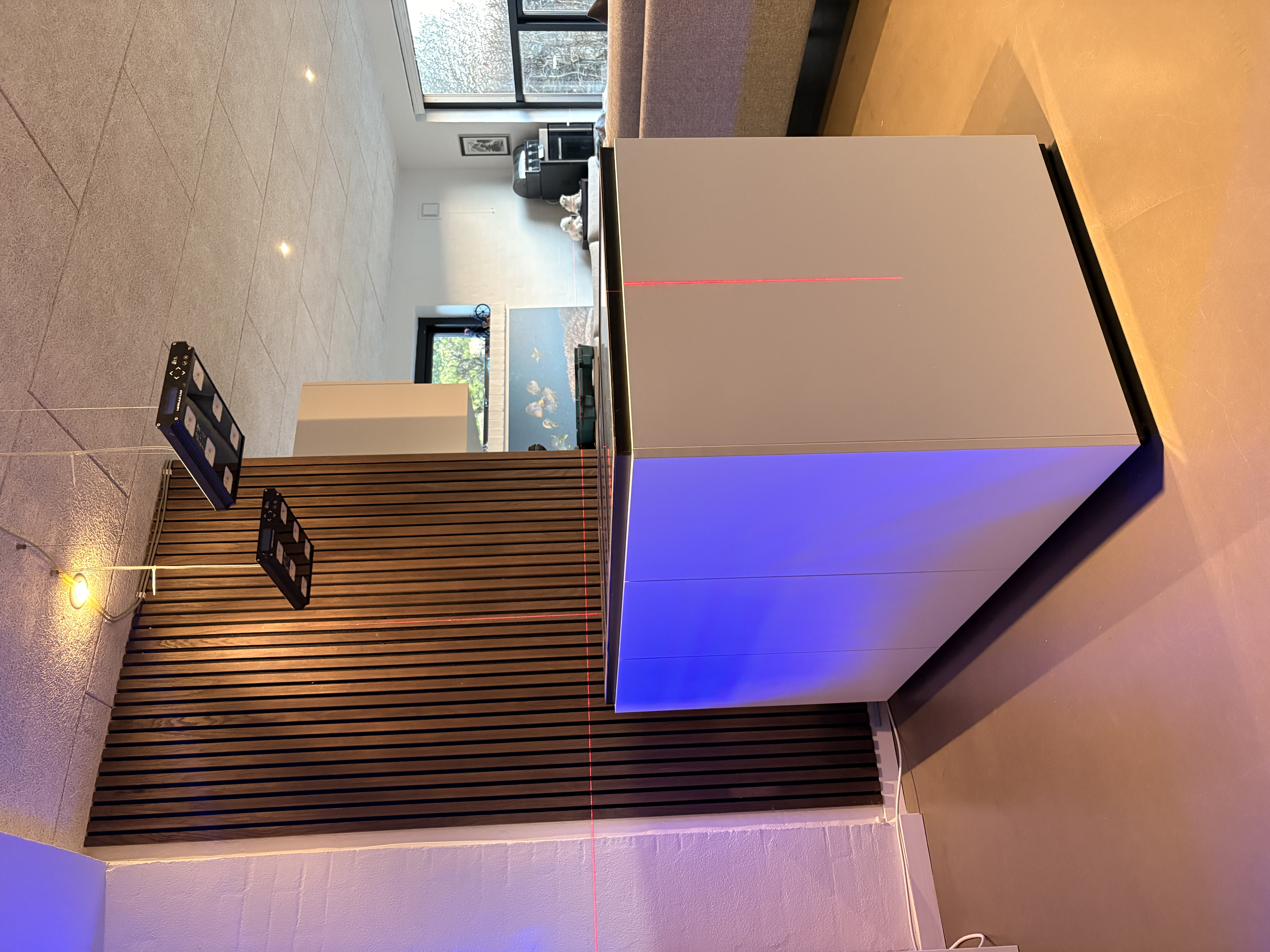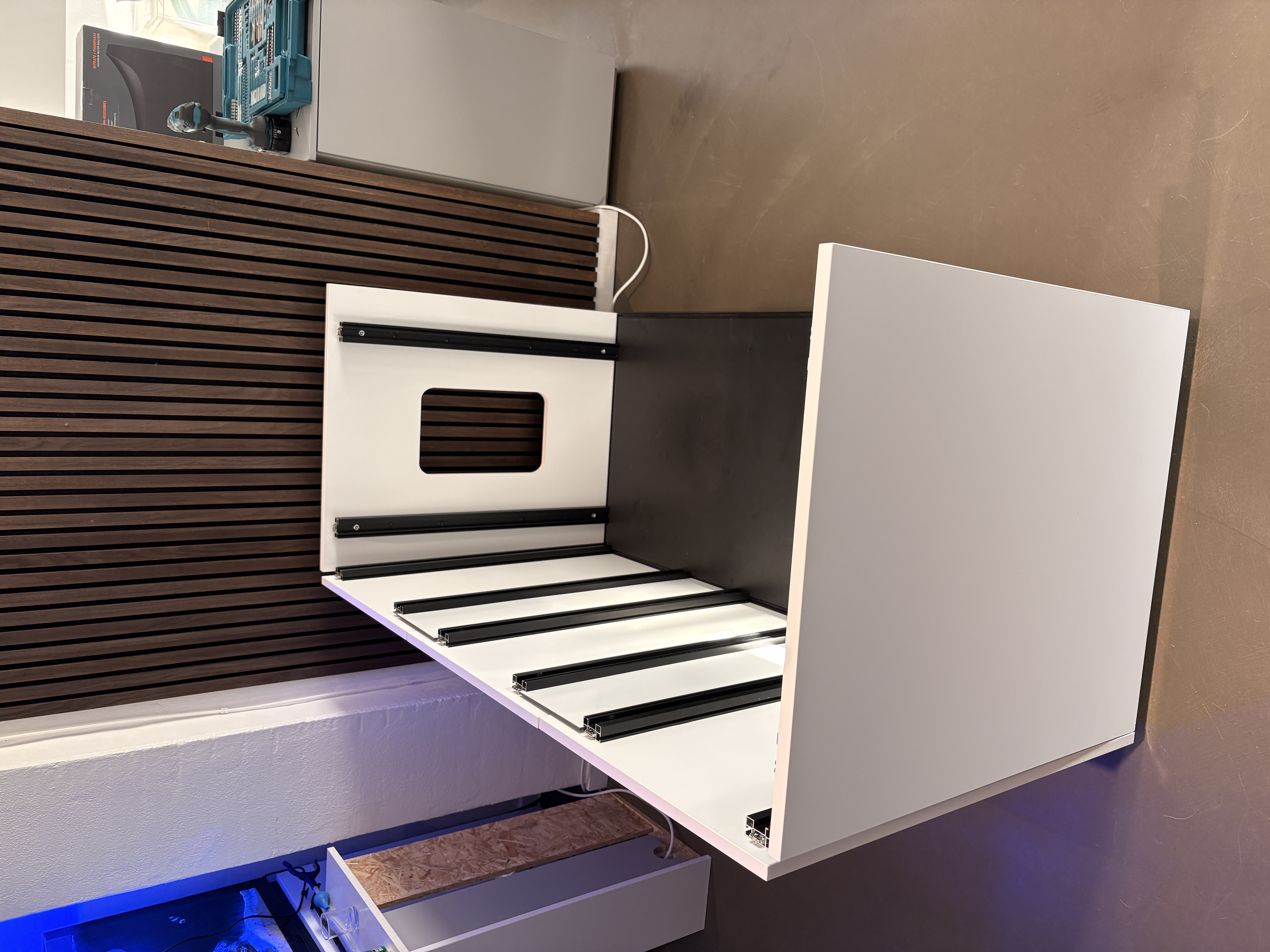 Ikke så stort som dit, jeg fik mit lavet på 150x65x60 med indvendig overflow, som virkelig er godt. Jeg synes som dig, det med pvc låger og bund gør de så let at tørrer af og man behøver ikke være bekymret for lidt spild. Virkelig en god opgradering af standen, ift normalt finner låger i mdf eller spånstræ.