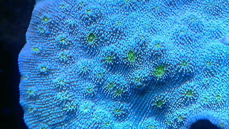 Echinopora i fuldt lys på en revkant lige under lampen, ca. 2cm under overfladen