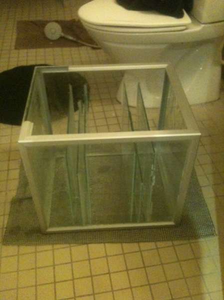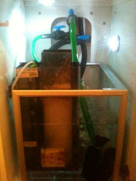 Jeg valgte den med alukant for at holde den stabil - dog som det kan ses har jeg skåret lidt i den for at få min skummer til at være der. Der er dobbelt dobbeltfælde - og plads til levende sten i midten. Der er nok 5 kilo. Jeg kører 2 nedløb. Et der går direkte - og et mindre der kommer vand igennem igennem en filtersok. Ydermere er der en pose med kul i skummerkammeret.