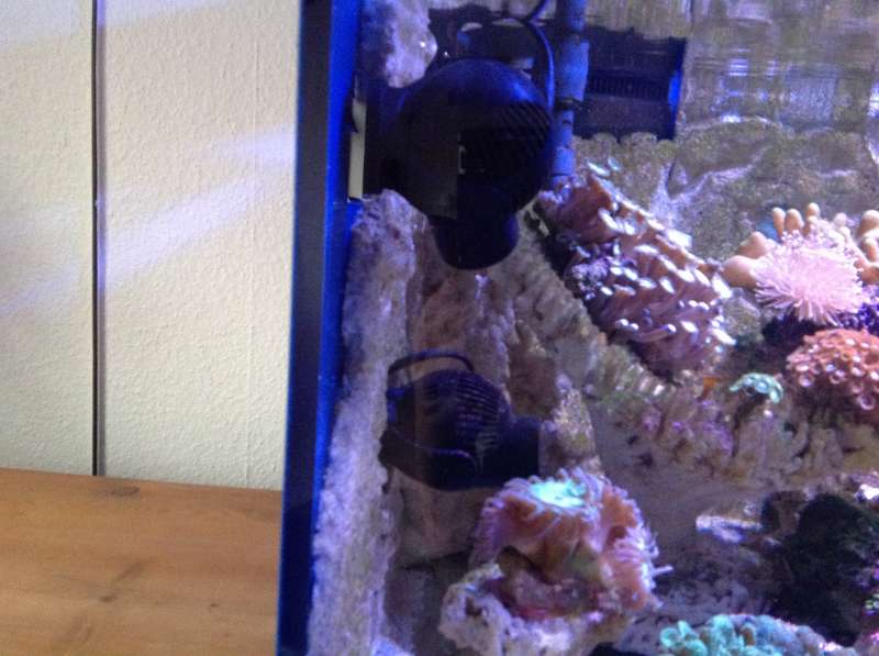 Jeg har mine pumper i hver ende, altså to på hvert endeglas. Dem der sidder bagerst sidder pænt langt nede for at pumpe godt langs bagruden og bag sten mv så der ikke ophobes en masse man ikke ser. De to bagerste pumper peger imod hinanden. De to andre har jeg placeret så de arbejder sammen om at roterer resten af vandet rundt. De peger derfor hver sin vej.