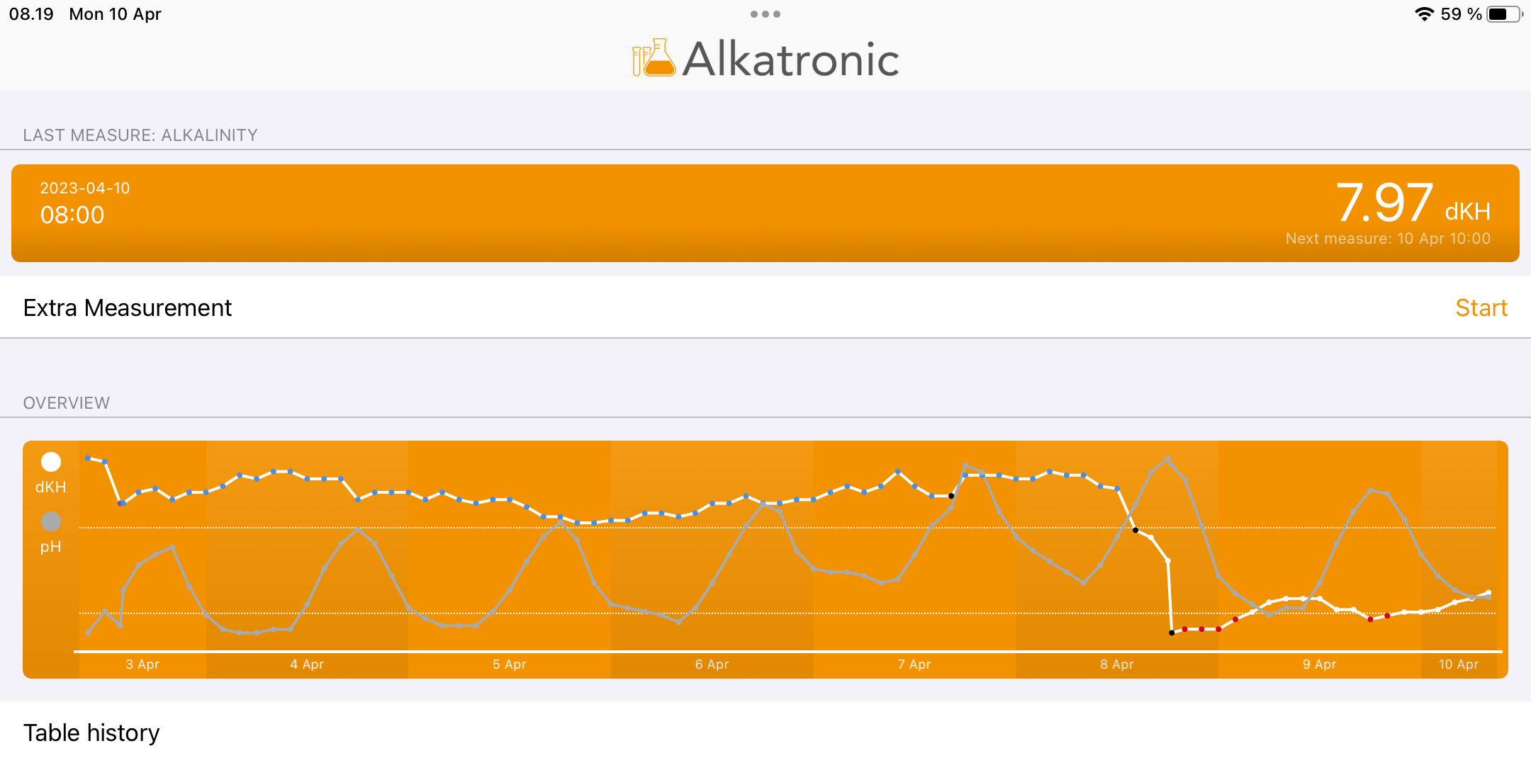 Edit: glemte dagens tal. PH er stadigvæk lav, efter ny probe. Skal have fundet en holdbar løsning på vandet fra kalkreaktoren