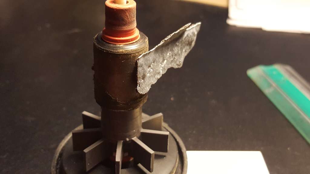 Vi bygger det på det som de næste billeder viser. Akslen er en keramisk aksel og de er meget hårde. De kan klare temmelig meget. Men akslen var tydeligt deformeret. Skal man nu være bekymret, hvis man kører med kalkreaktor? Det tror jeg ikke.