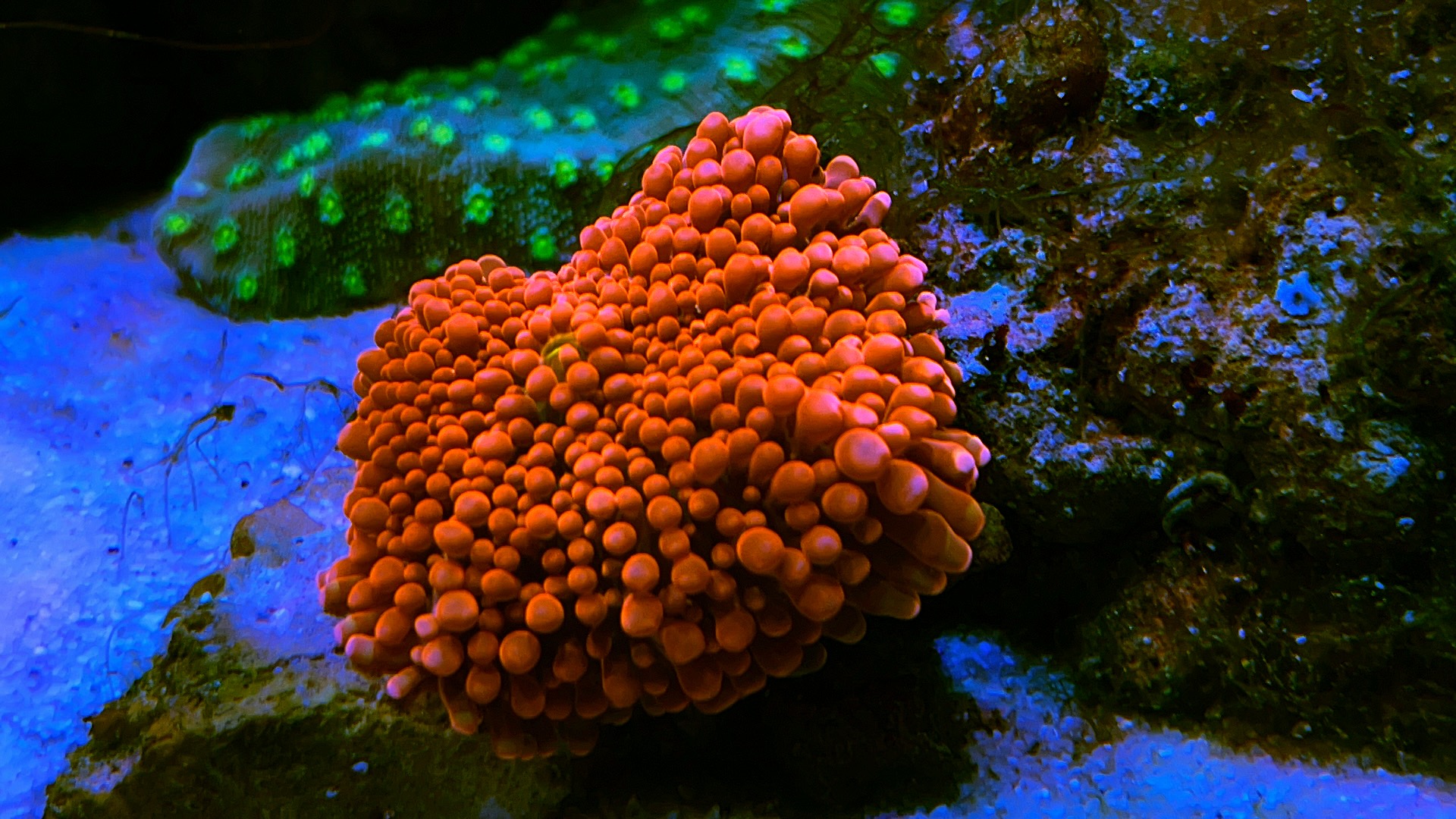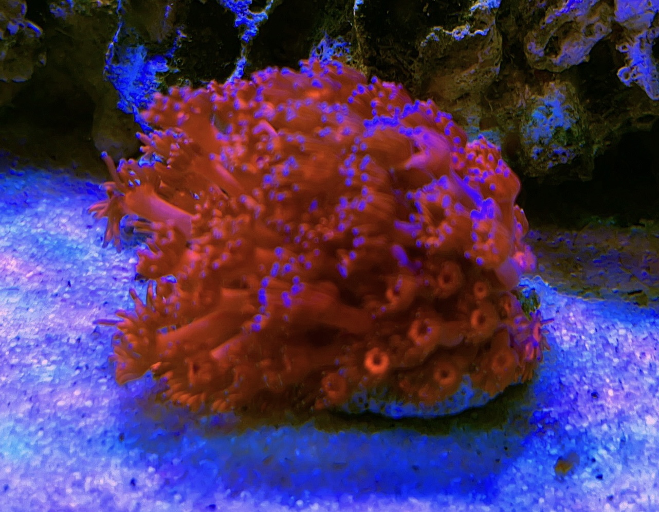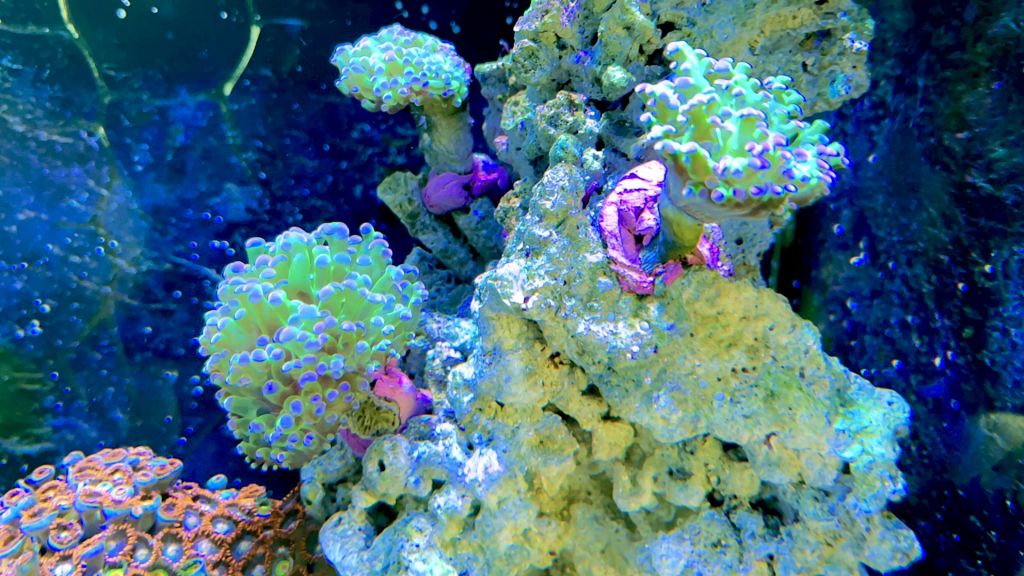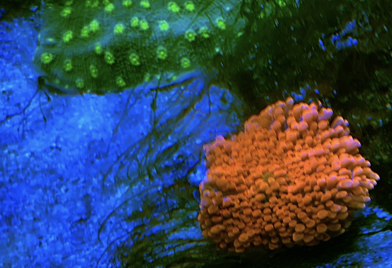 Homophyllia klumpen overvejer jeg at skille lidt ad. Den nederste gule er pænt “træt” kan man se….. Jeg giver dem lige lidt tid og hvis den ikke retter sig så må jeg igang m hammer og mejsel 👍🏼