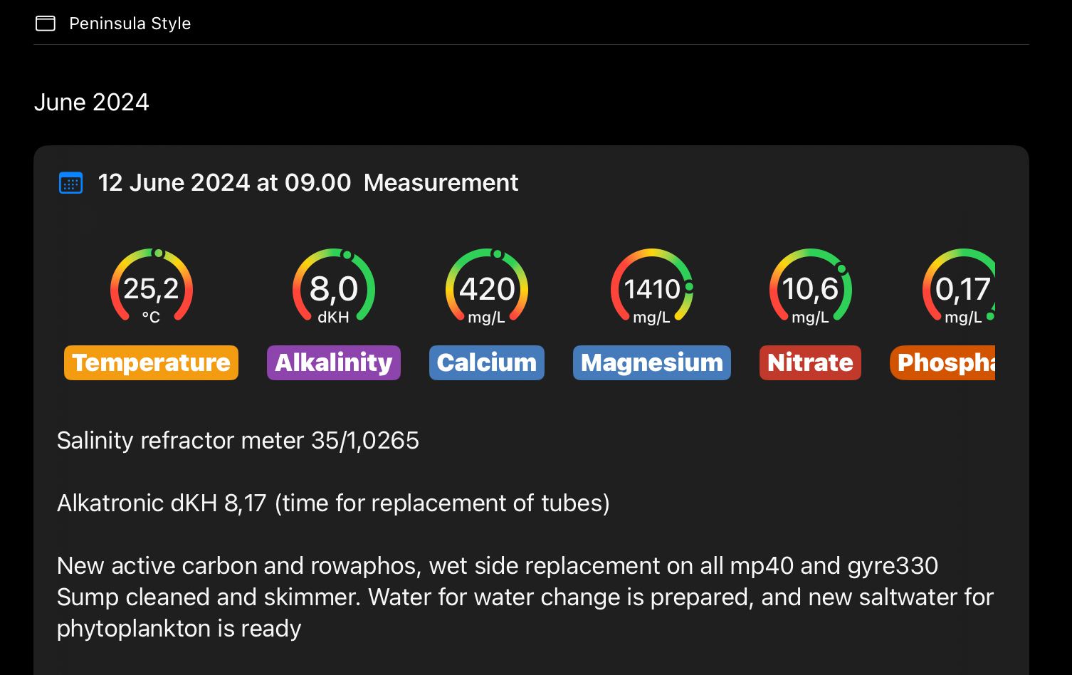 Dagen efter vandskift, tager jeg altid en måling af parameterne , da ting kan ændre sig, eks. No3 og Po4 som i mit tilfælde, når jeg går gennem bundlaget,under stenende og blæser alt op med en pumpe, for at få det ud i vandsøjlen og derefter dosere coralsnow, for at få det filteret hurtigt ud.