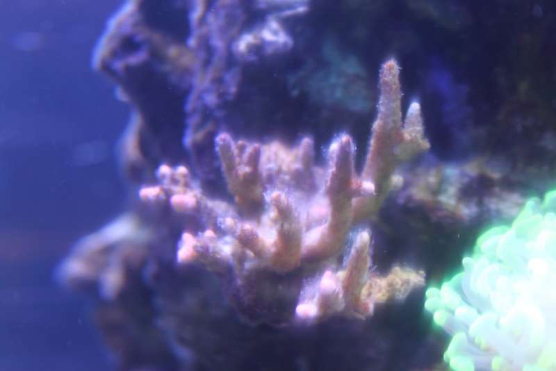 Jeg kom også til at købe en Hydnophora: Og endnu en jeg ikke kan navnet på: Mine Acanstrea'er har det godt: Det samme har mine minicarpetanemoner: Desværre betød de fejl jeg har begået, og som er nævnt tidligere i denne tråd, at flere af de koraller jeg havde døde, denne var umiddelbart en af dem, men der er sgu liv i spidserne, hvis man kigger nøje efter! Dette ses bedst i RB-lys, men er næsten umuligt at tage billeder af, så her er et i almindeligt lys: Så har jeg også denne, som undrer mig? Jeg kan ikke hitte ud af hvad den er heller... Og så er der en af de gamle, som faktisk har det ret godt: