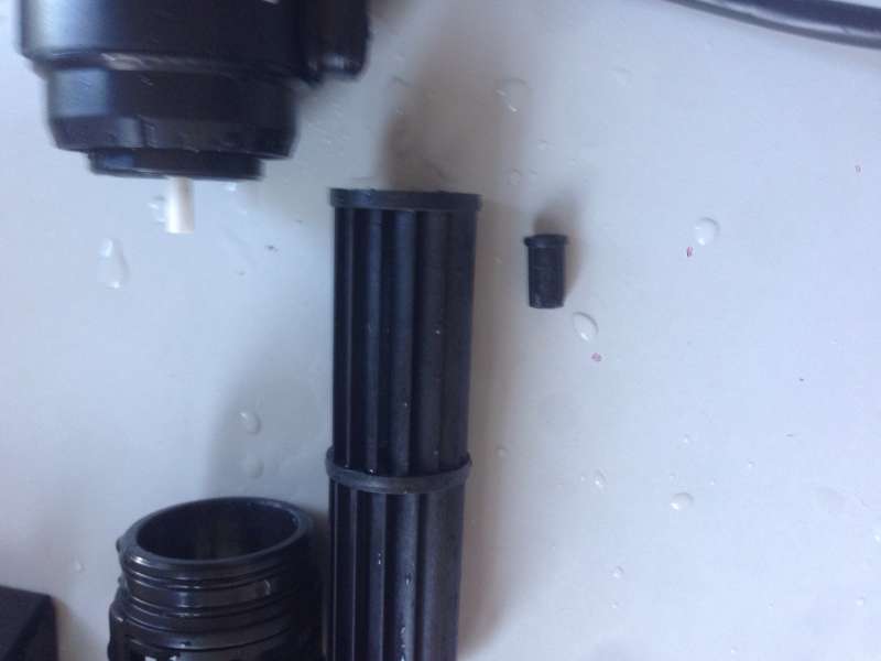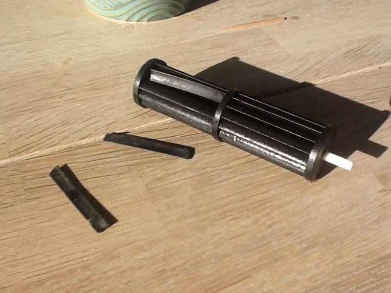 Jeg åbner den så fordi der jo må være noget galt, hvorefter jeg finder denne her sorte dut, inde i en af rotorne?????? Det er ikke en af de stykke plastik fra motoren og ind i akslen, kraven er for lille, så de er ikke ens.. Hvor hører han hjemme ??