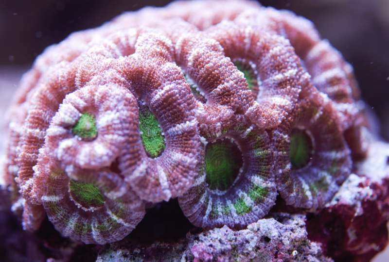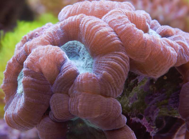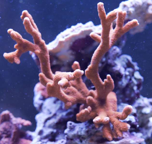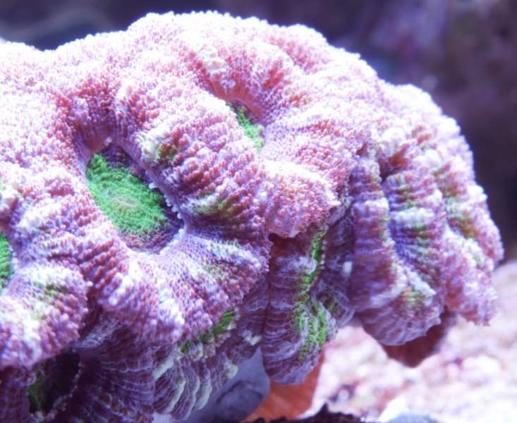Den er faktisk vokset rigtigt godt her i huset. Den er dobbelt så stor som da jeg købte den for ca 2,5 måned siden. Sjov koral.... Den flytter sig lidt hen over bunden, om morgenen er den meget lille, men i løbet af dagen puster den både den grønne base og polypperne meget op. Flyttede den lidt forleden dag. Det pink i spidsen af polypperne smitter meget af og går nemt af dem, men kommer igen over et par døgn.