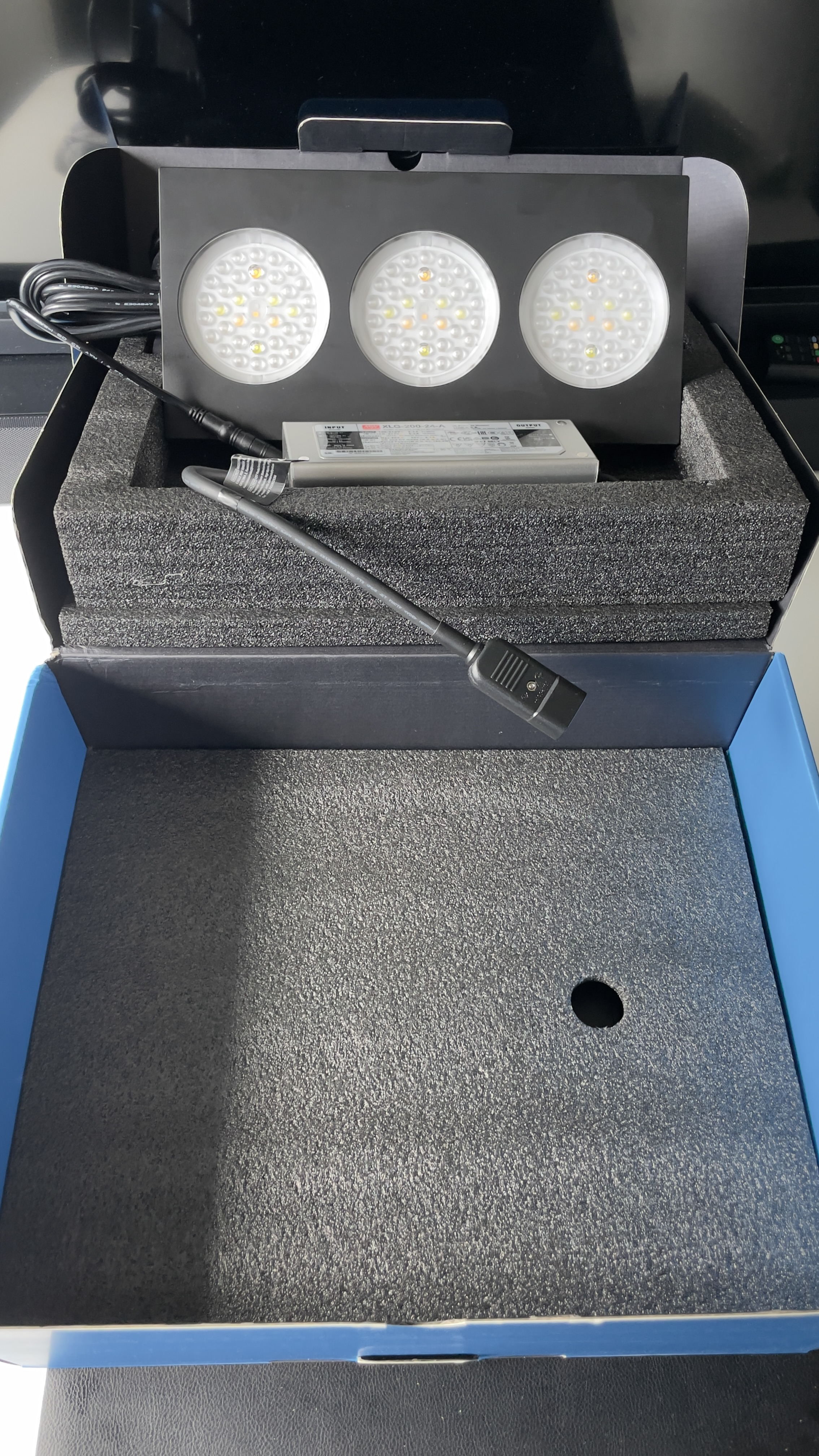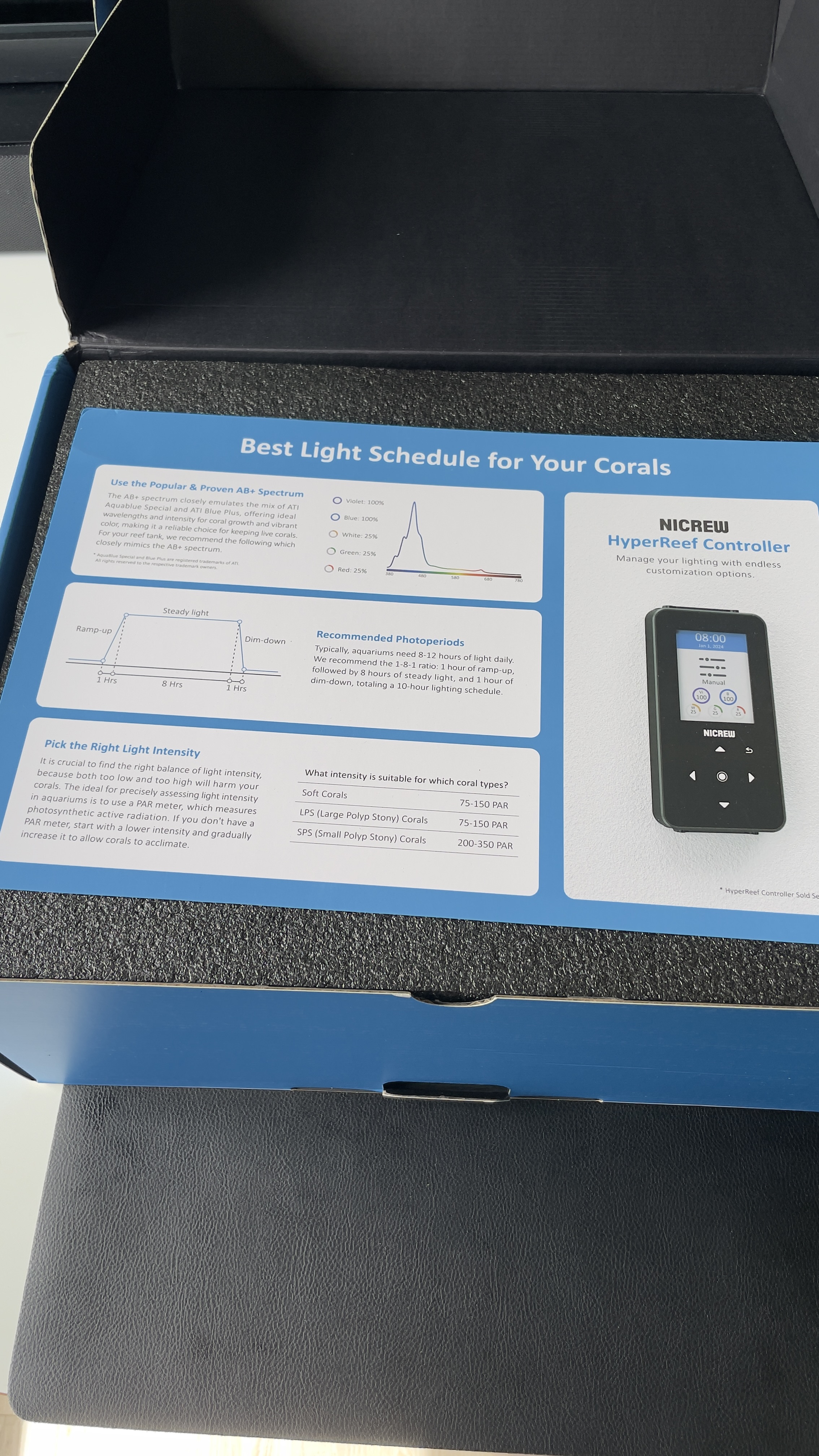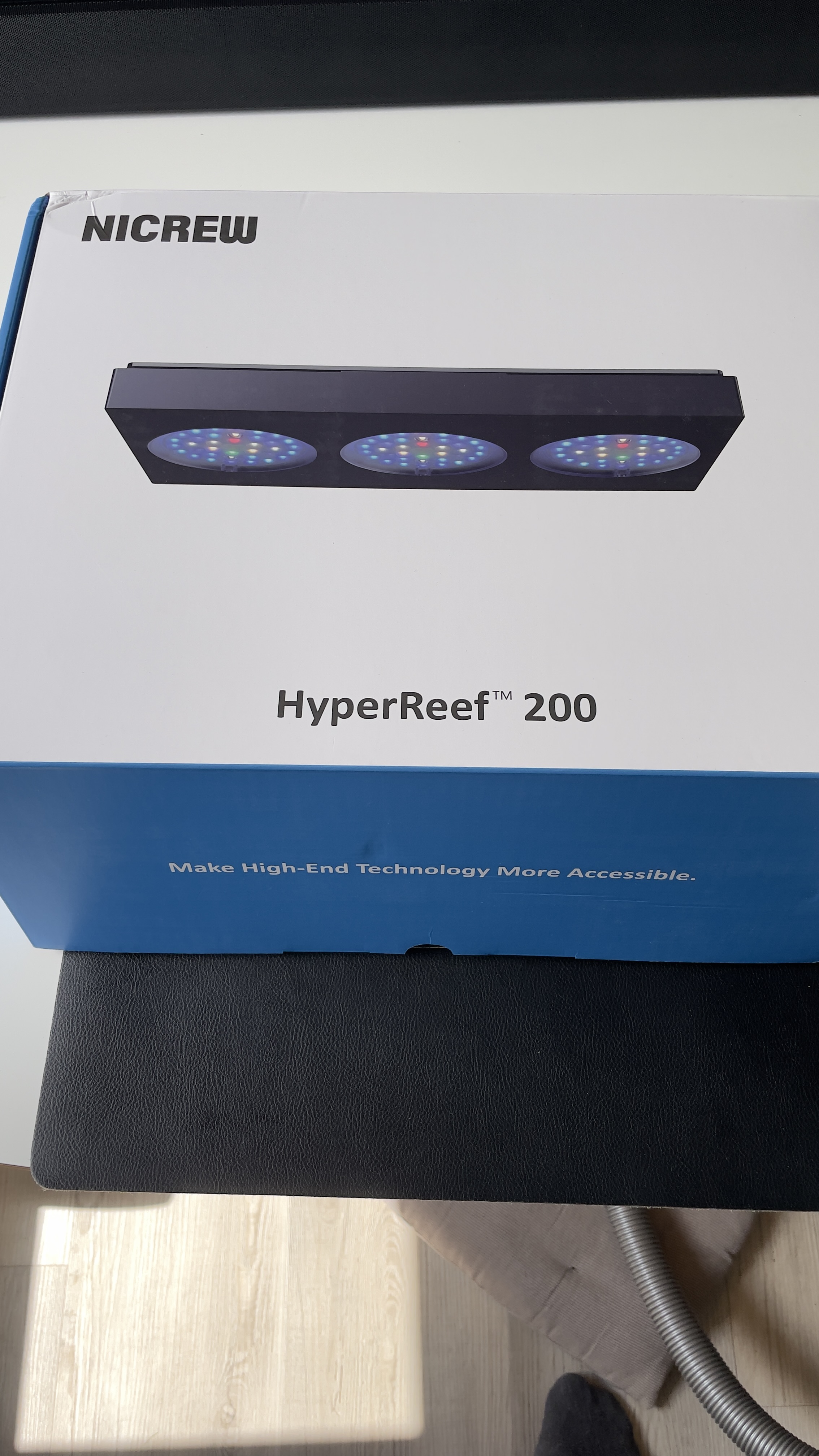 De nye hedder Nicrew HyperReef Gen 2 200W, som er en mellem pris klasse lampe, og incl. arme. Kommer med posten i dag sammen med kalibreringsvæske